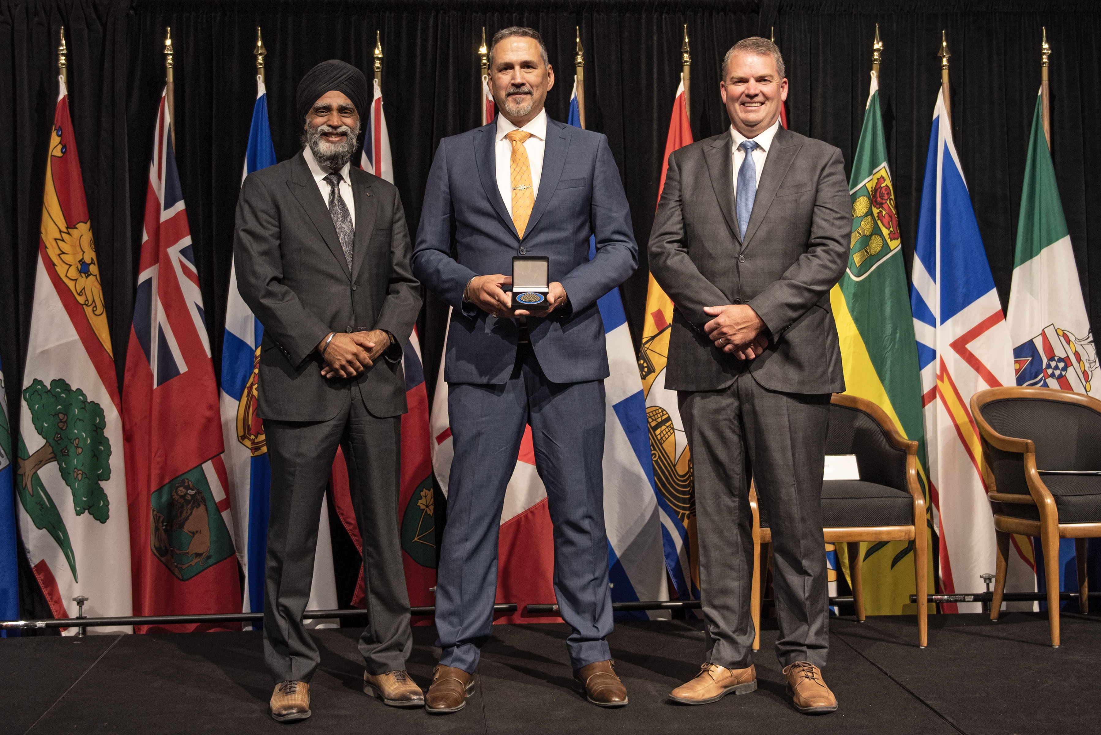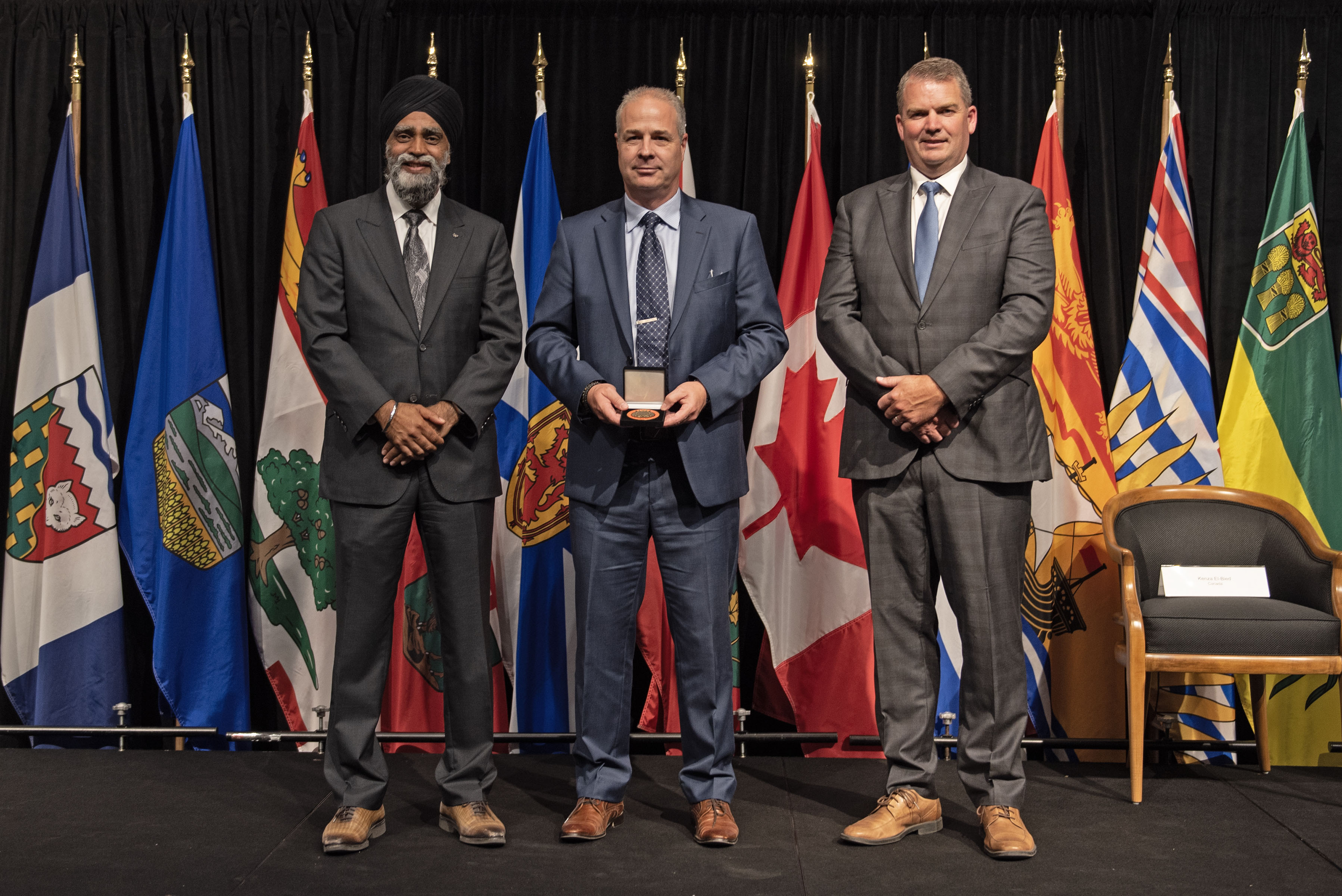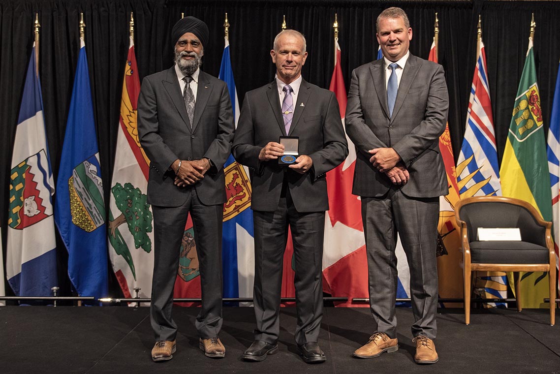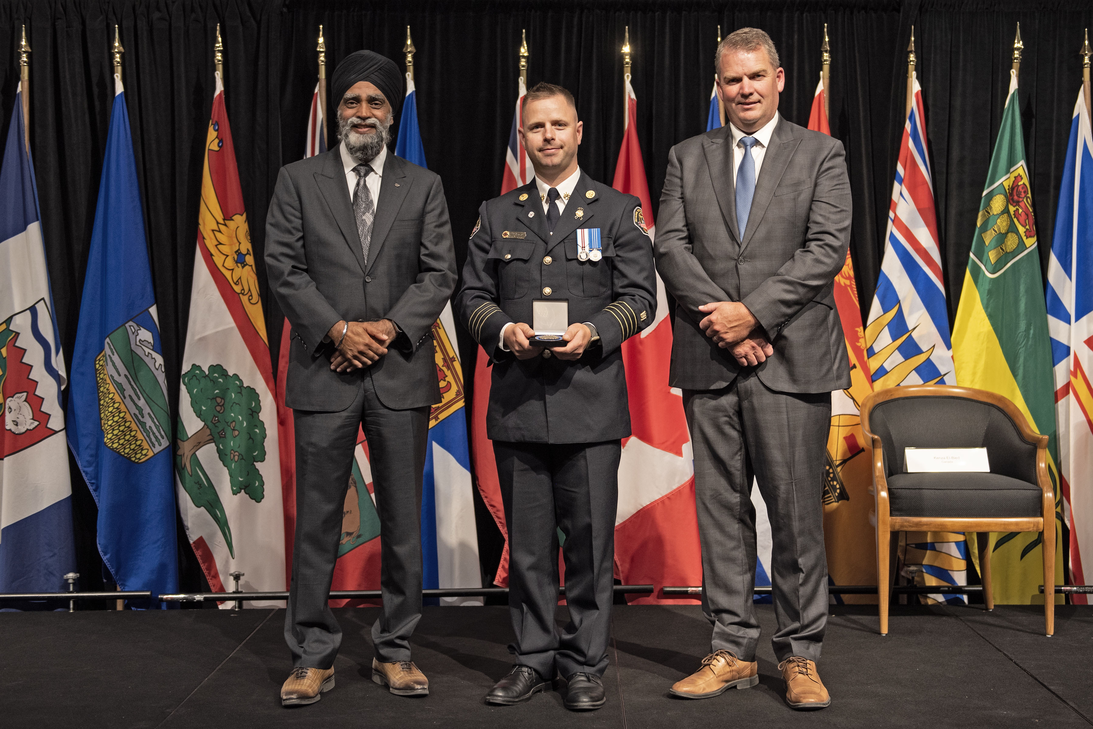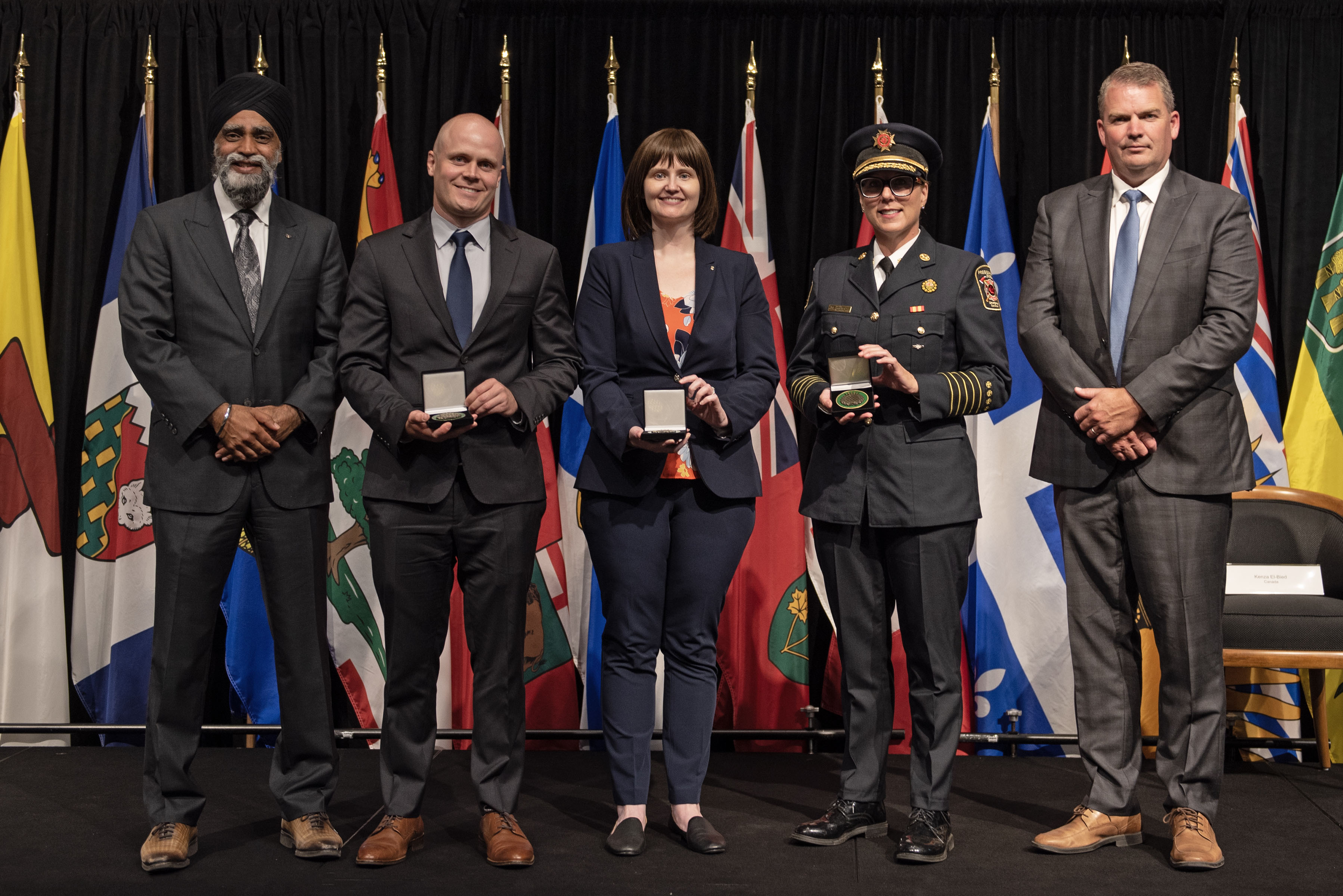 L'honorable Harjit S. Sajjan, président du Conseil privé du roi pour le Canada, ministre de la Protection civile et ministre responsable de l'Agence de développement économique du Pacifique du Canada (à l'extrême gauche), et l'honorable Bloyce Thompson, vice-premier ministre, procureur général, ministre de la Justice et de la Sécurité publique, Île-du-Prince-Édouard (à l'extrême droite) sont photographiés en compagnie du lauréat 2022 du Prix pour service exemplaire en sécurité civile pour la catégorie de contribution remarquable à la gestion des urgences.