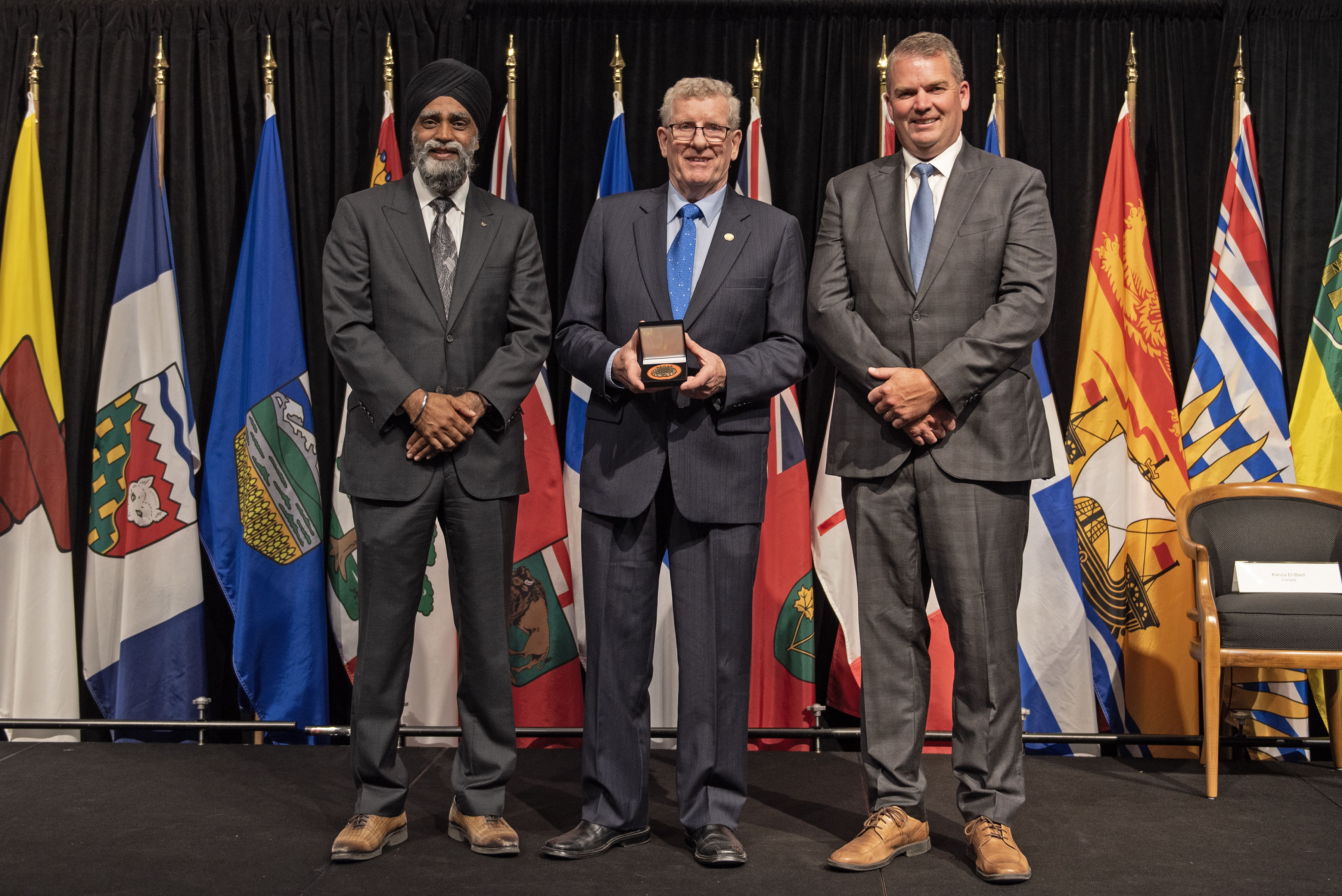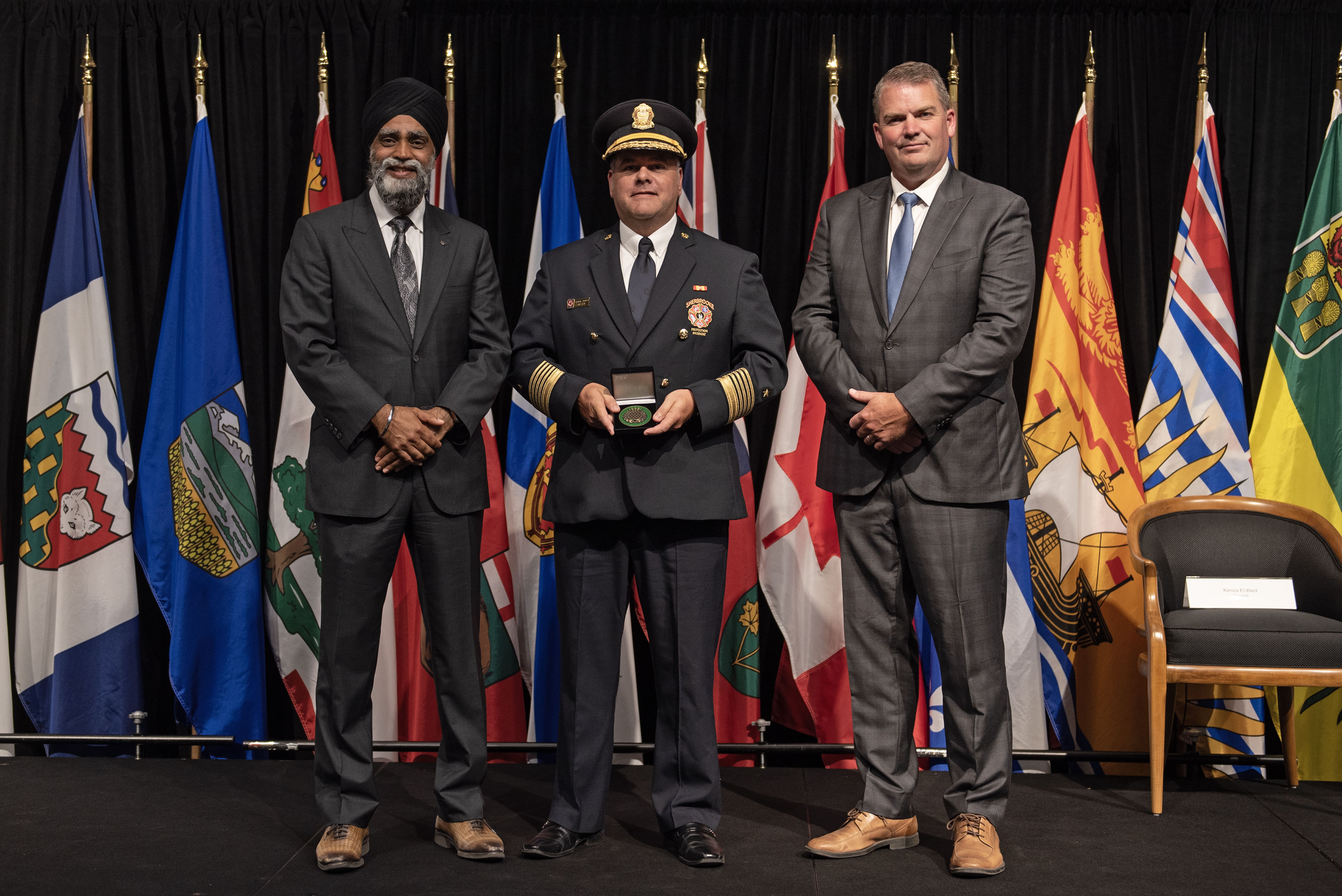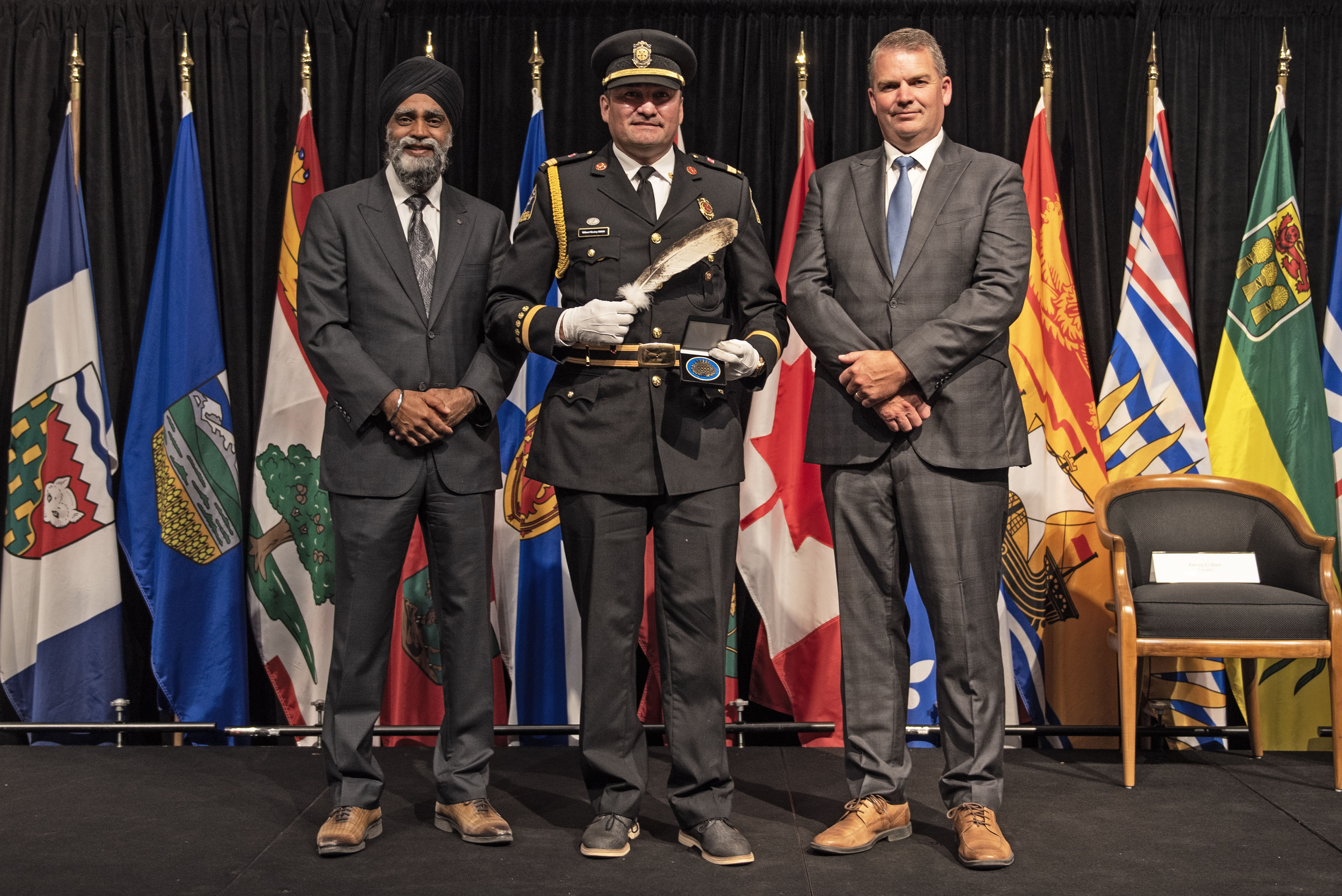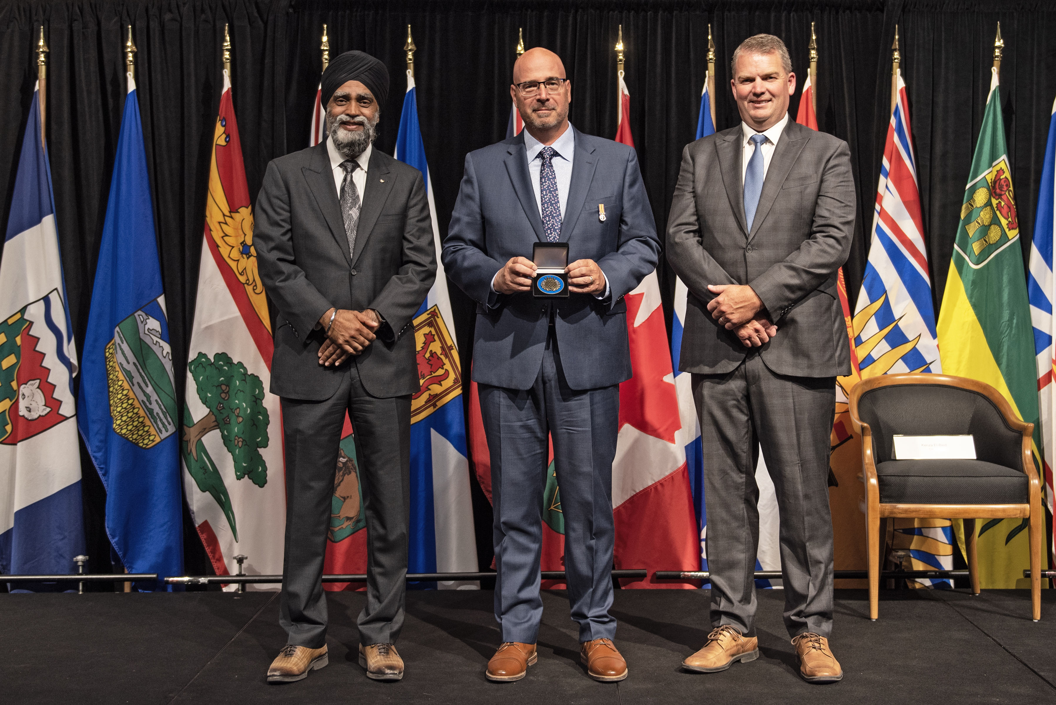 L'honorable Harjit S. Sajjan, président du Conseil privé du roi pour le Canada, ministre de la Protection civile et ministre responsable de l'Agence de développement économique du Pacifique du Canada (à l'extrême gauche), et l'honorable Bloyce Thompson, vice-premier ministre, procureur général, ministre de la Justice et de la Sécurité publique, Île-du-Prince-Édouard (à l'extrême droite) sont photographiés en compagnie du lauréat 2022 du Prix pour service exemplaire en sécurité civile pour la catégorie de contribution remarquable à la gestion des urgences.