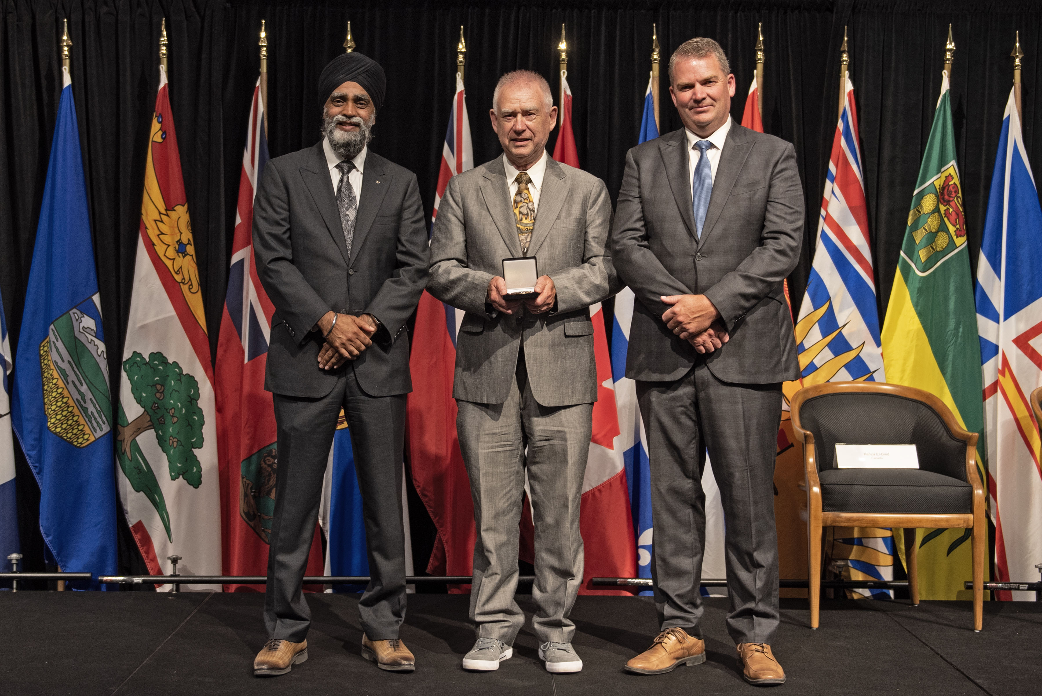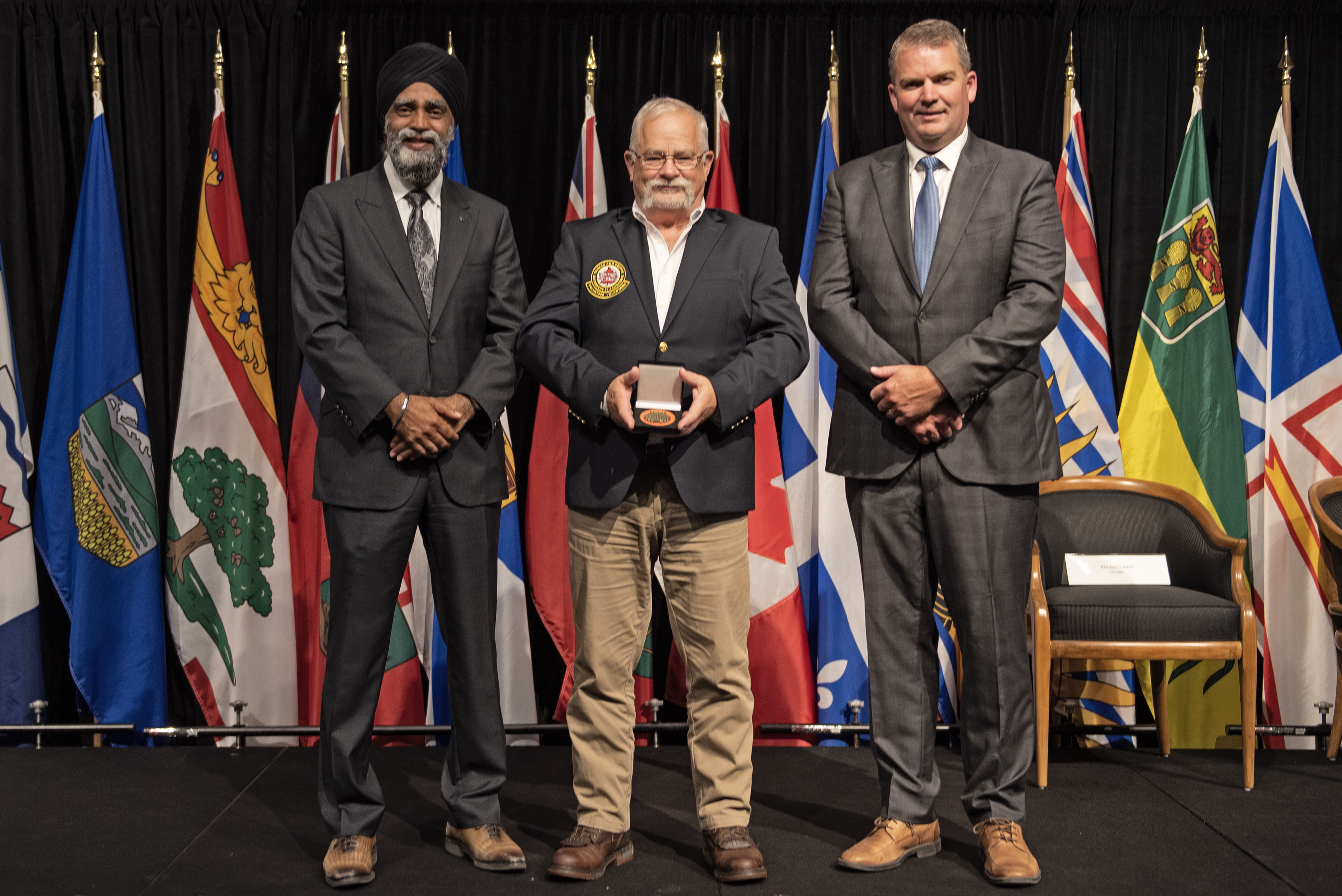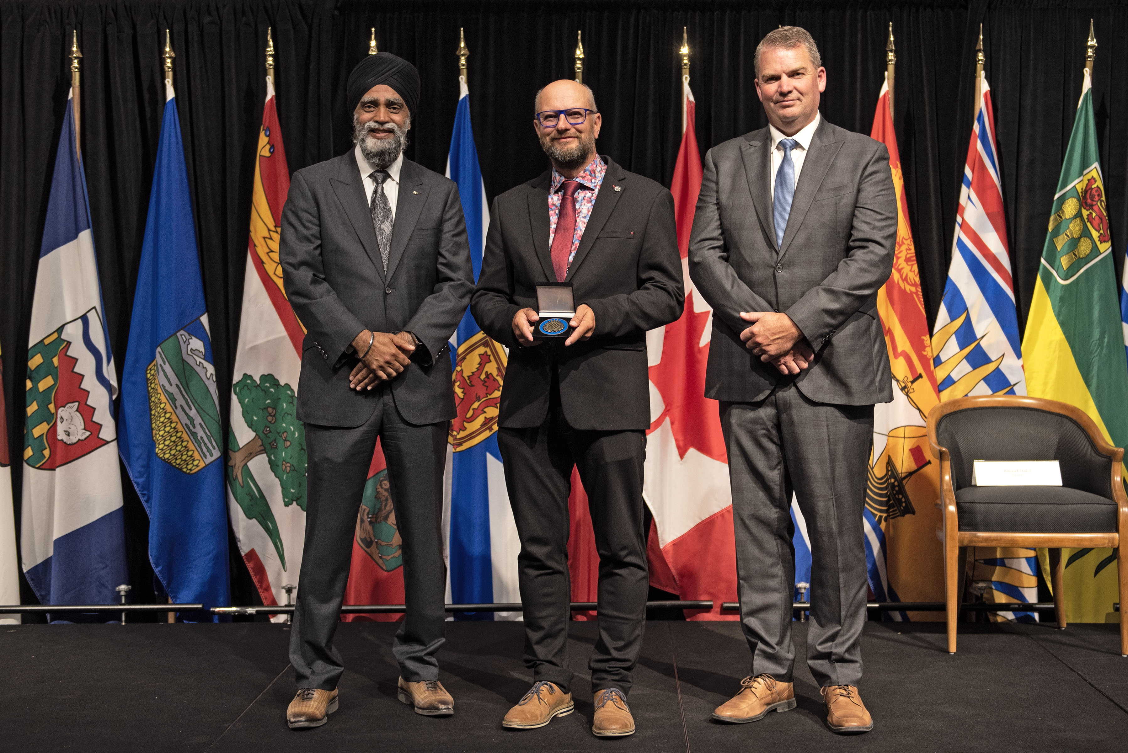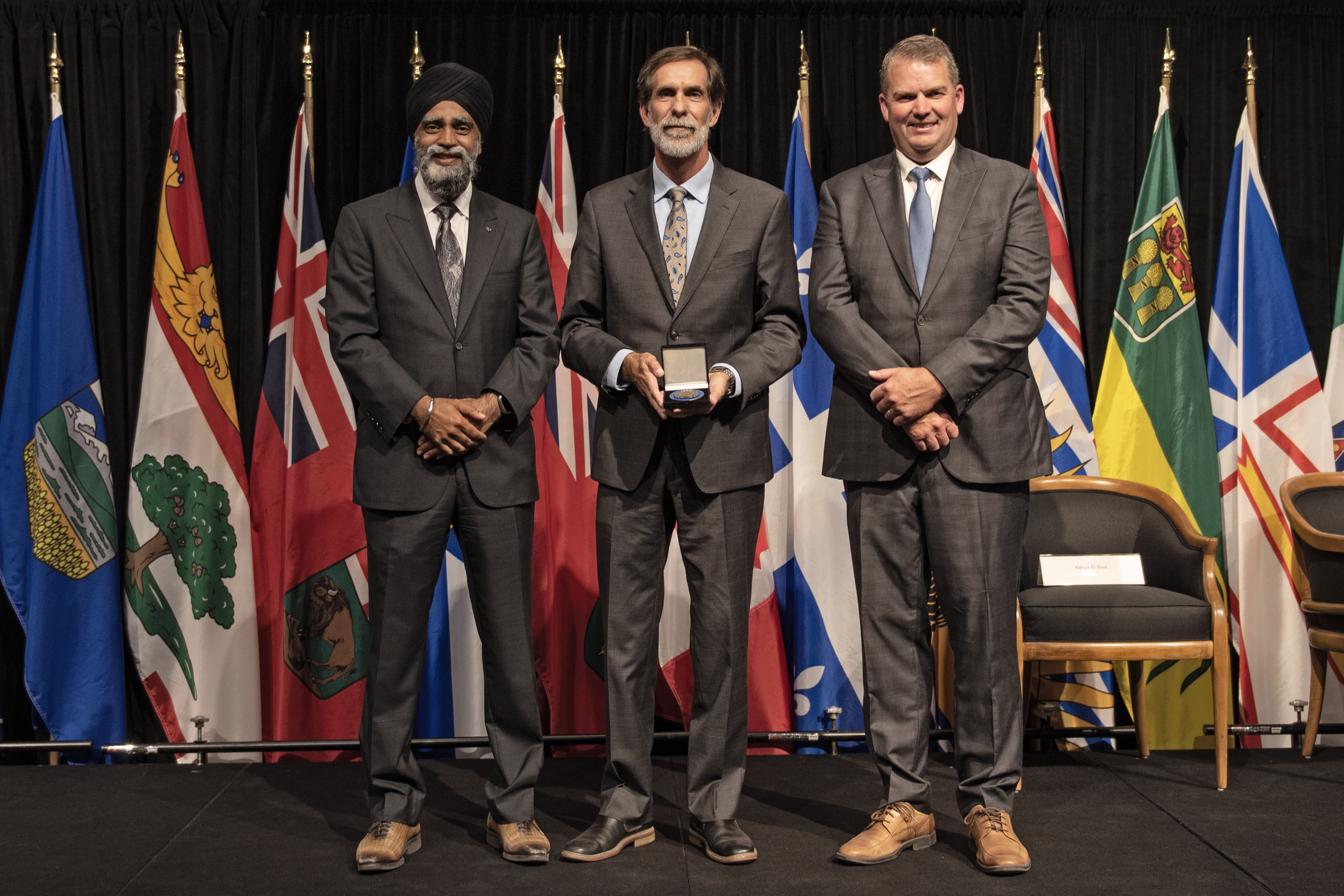 L'honorable Harjit S. Sajjan, président du Conseil privé du roi pour le Canada, ministre de la Protection civile et ministre responsable de l'Agence de développement économique du Pacifique du Canada (à l'extrême gauche), et l'honorable Bloyce Thompson, vice-premier ministre, procureur général, ministre de la Justice et de la Sécurité publique, Île-du-Prince-Édouard (à l'extrême droite) sont photographiés en compagnie du lauréat 2022 du Prix pour service exemplaire en sécurité civile pour la catégorie de contribution remarquable à la gestion des urgences.