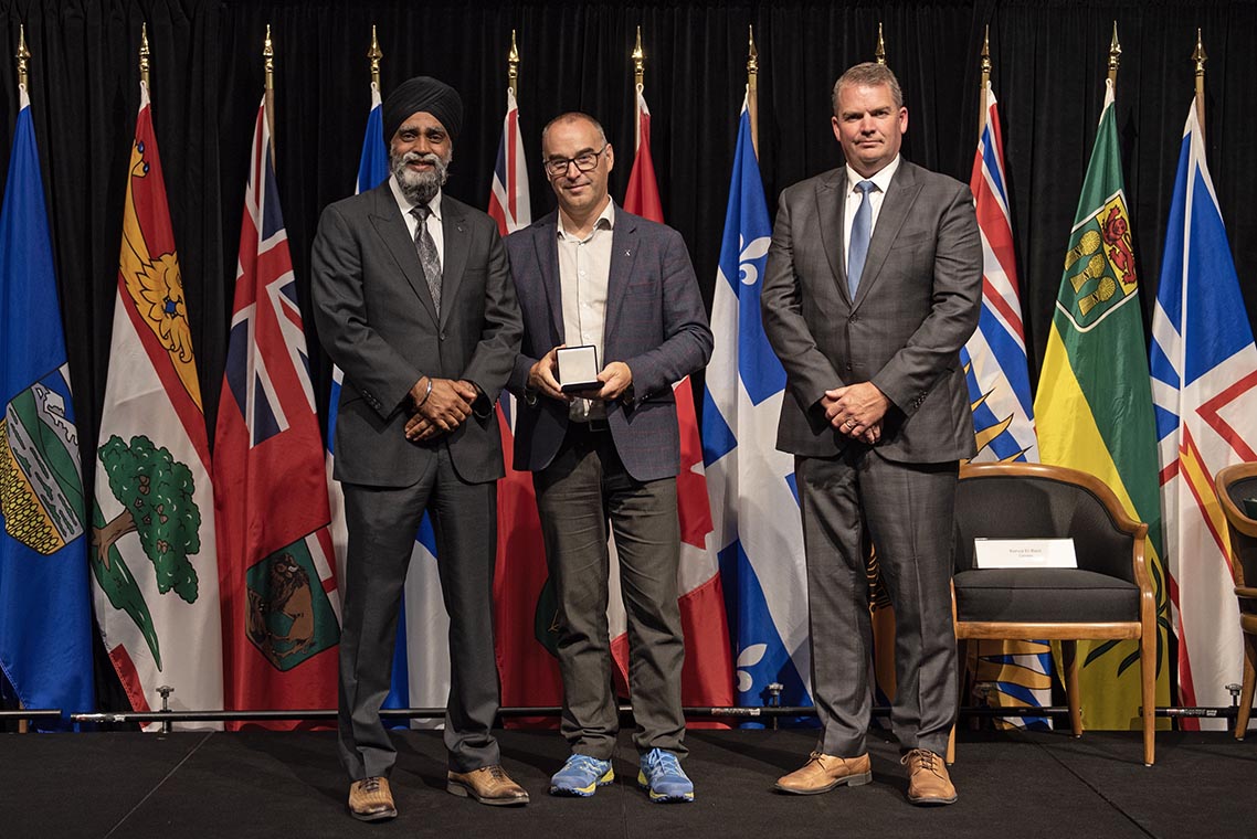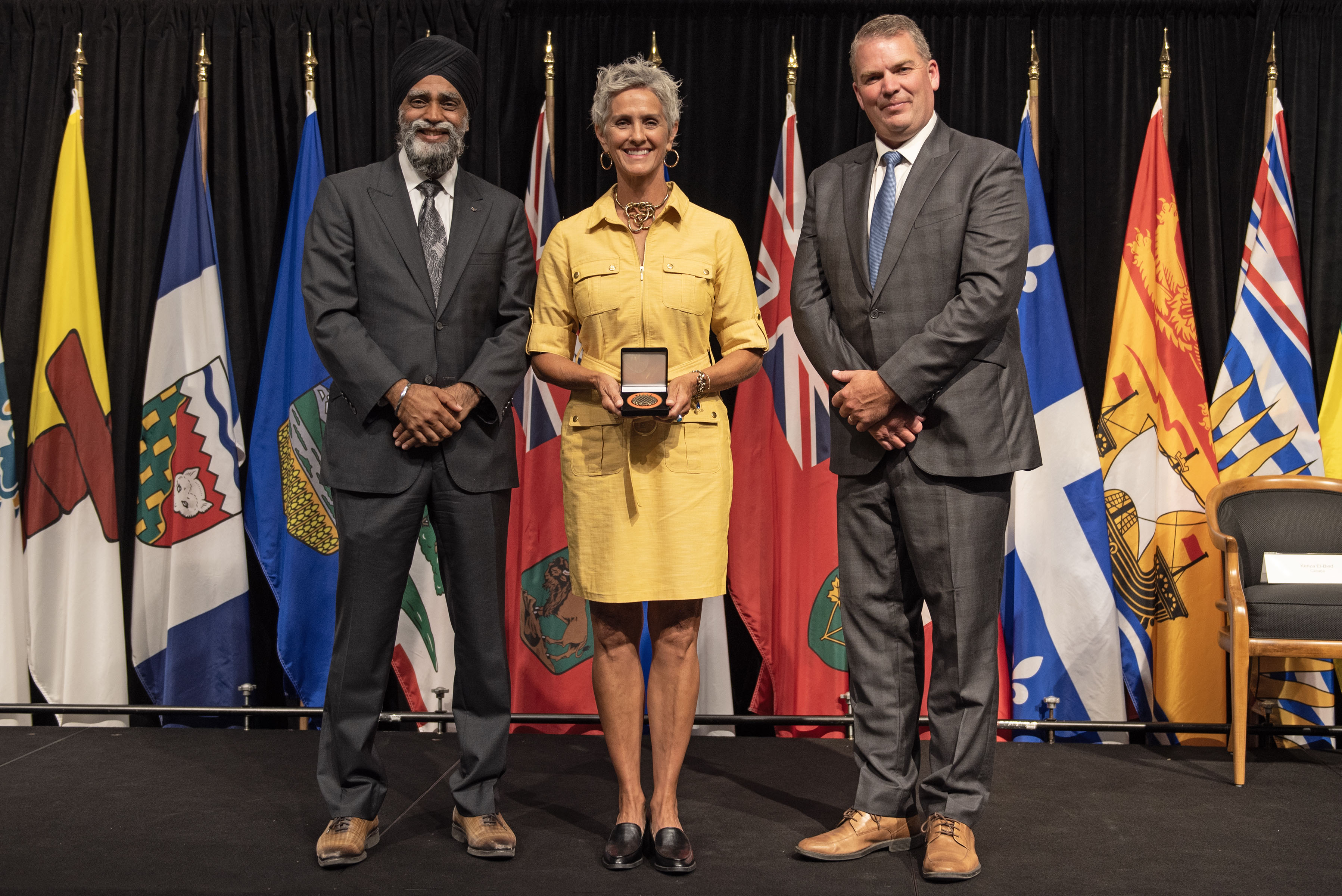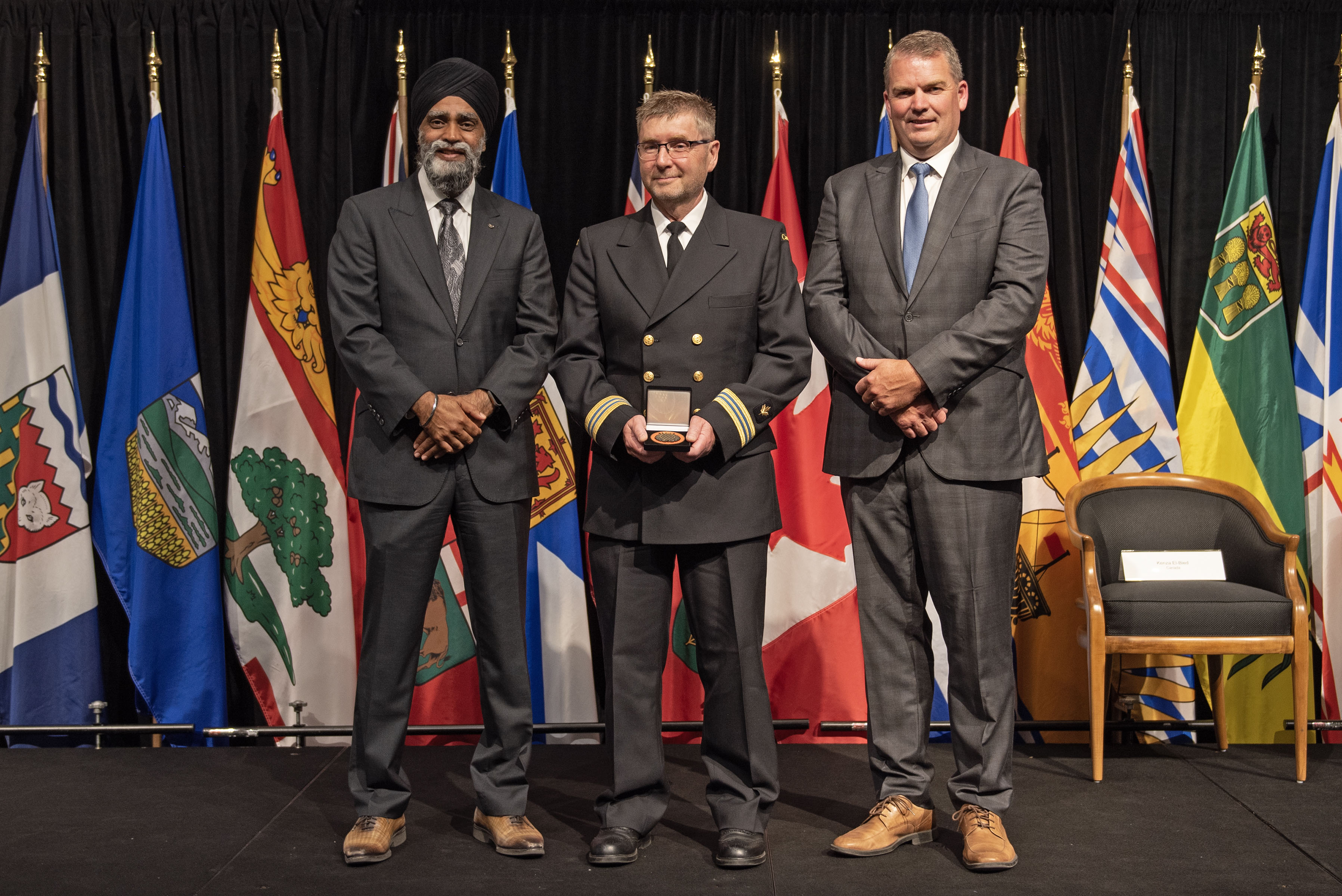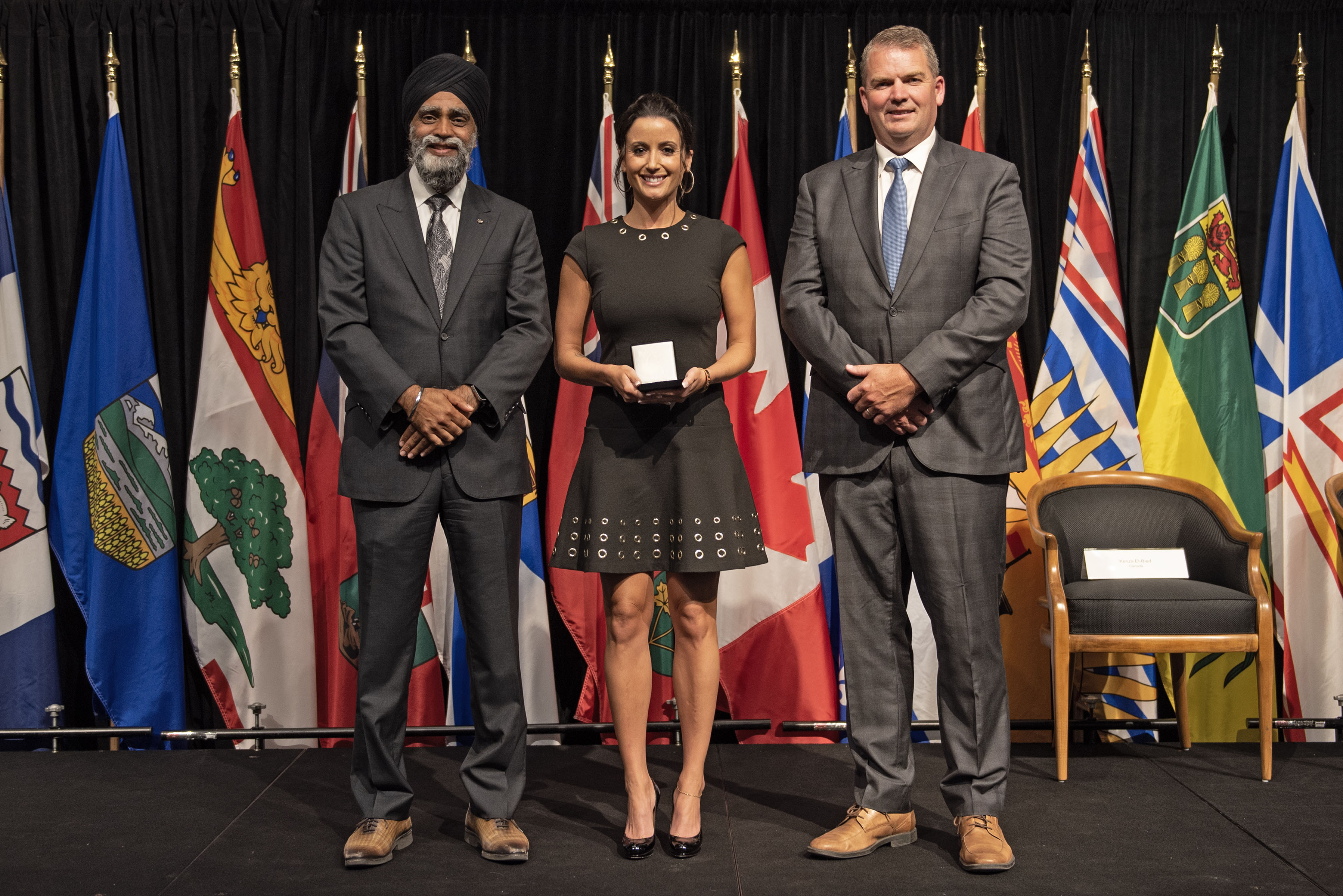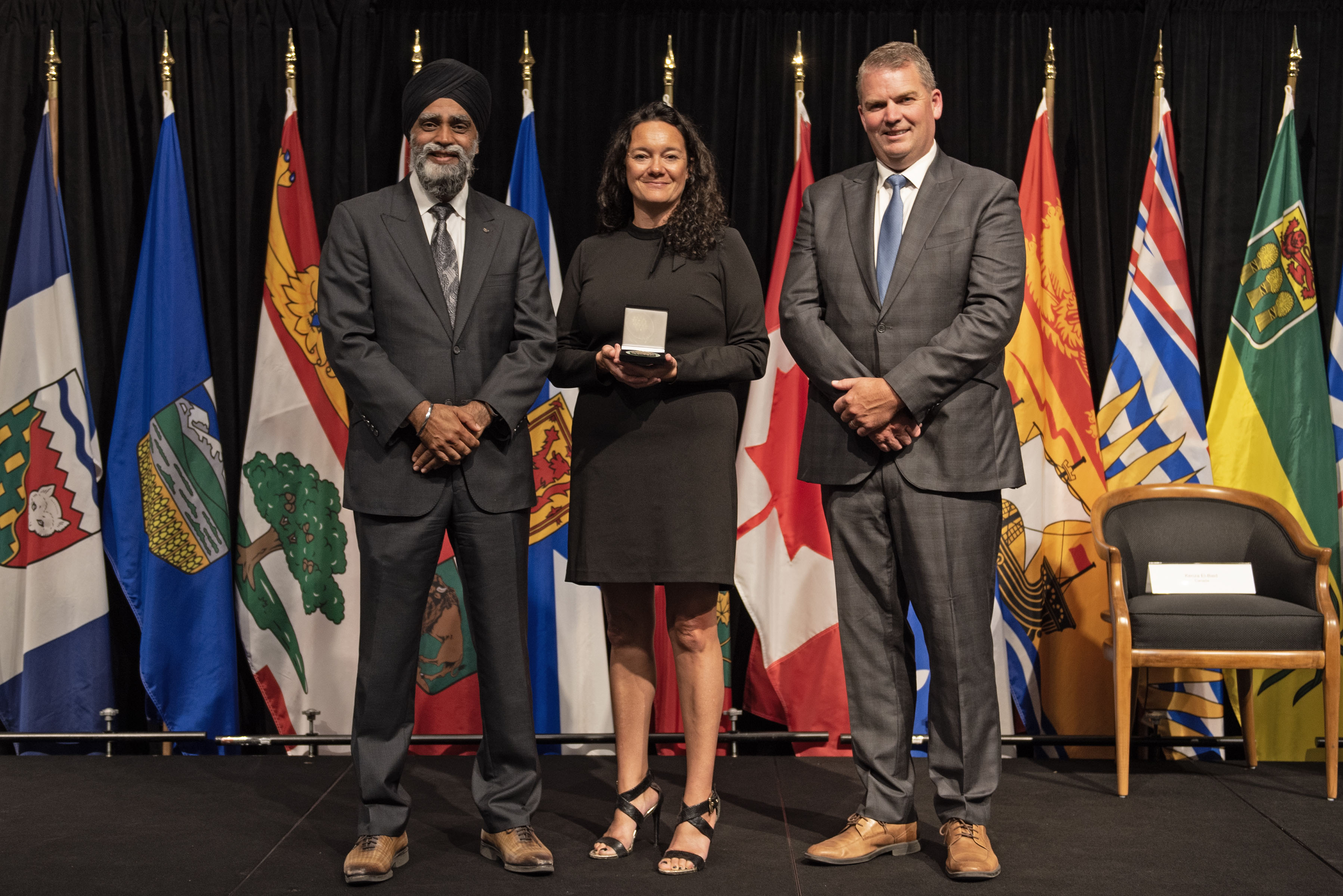 L'honorable Harjit S. Sajjan, président du Conseil privé du roi pour le Canada, ministre de la Protection civile et ministre responsable de l'Agence de développement économique du Pacifique du Canada (à l'extrême gauche), et l'honorable Bloyce Thompson, vice-premier ministre, procureur général, ministre de la Justice et de la Sécurité publique, Île-du-Prince-Édouard (à l'extrême droite) sont photographiés en compagnie du lauréat 2022 du Prix pour service exemplaire en sécurité civile pour la catégorie de contribution remarquable à la gestion des urgences.