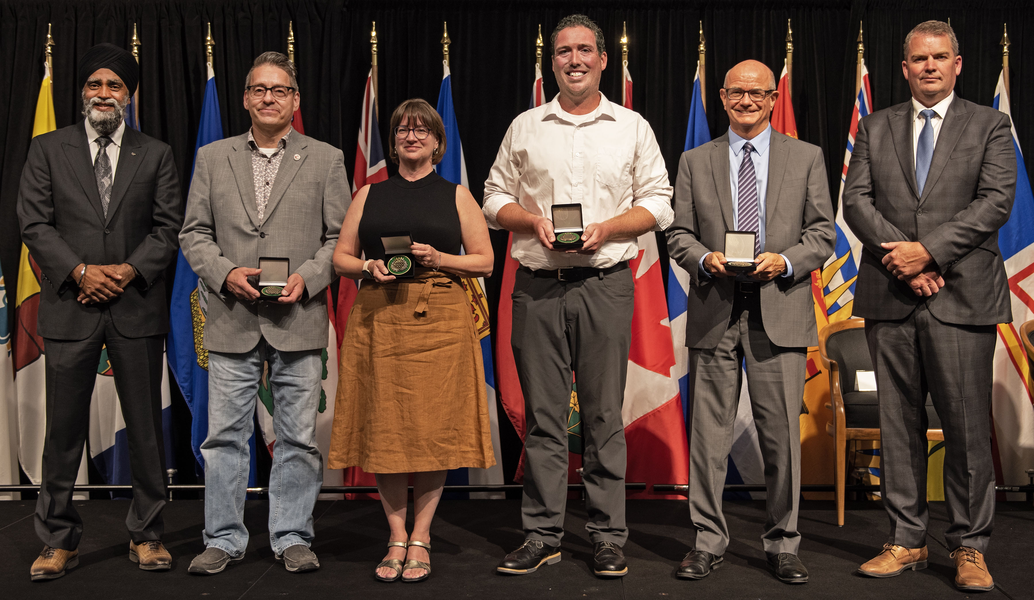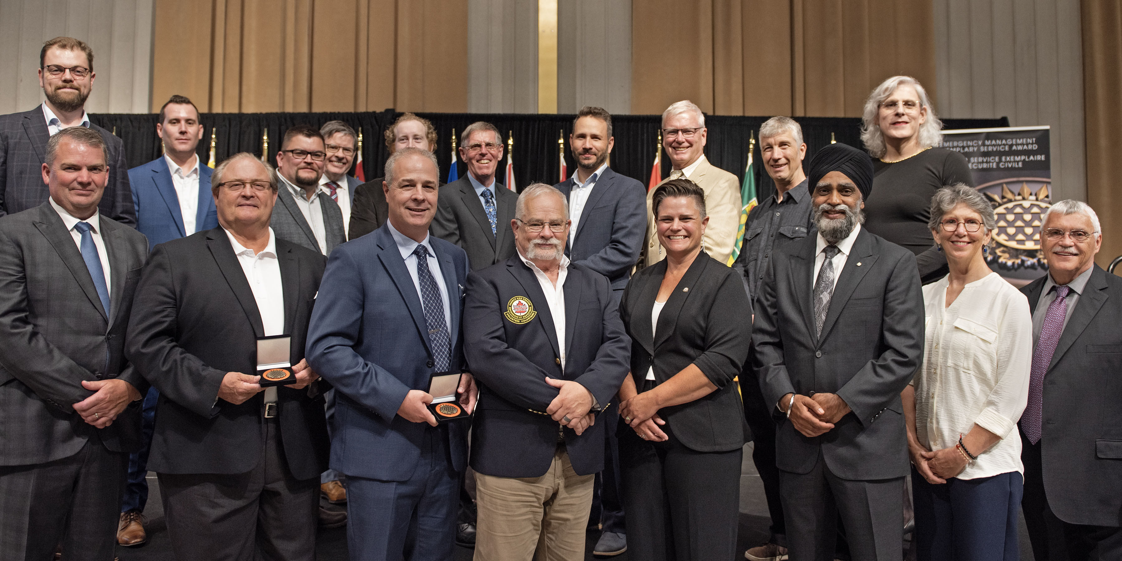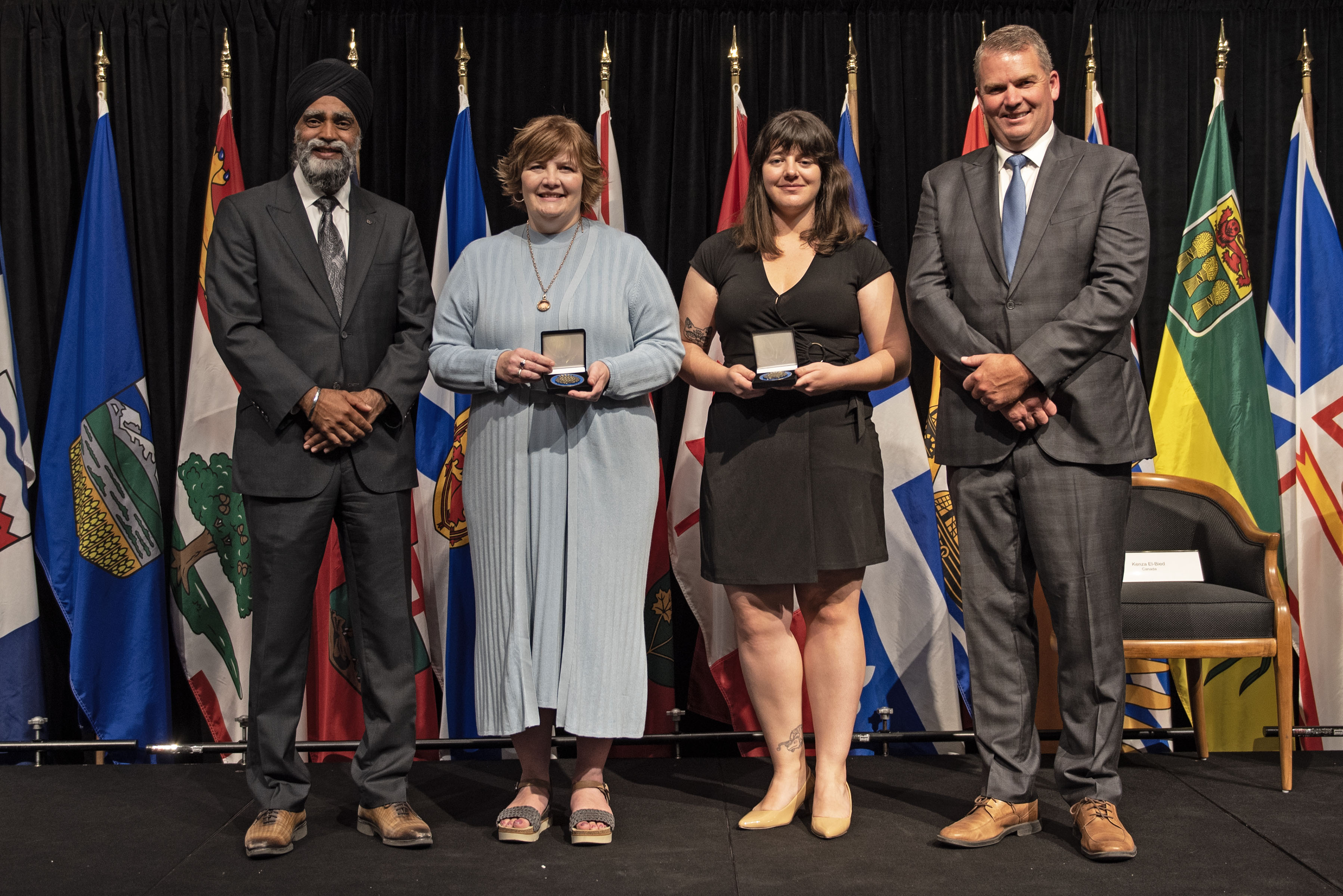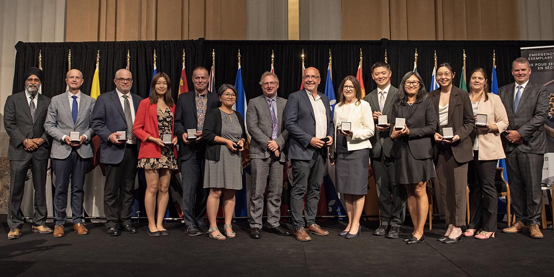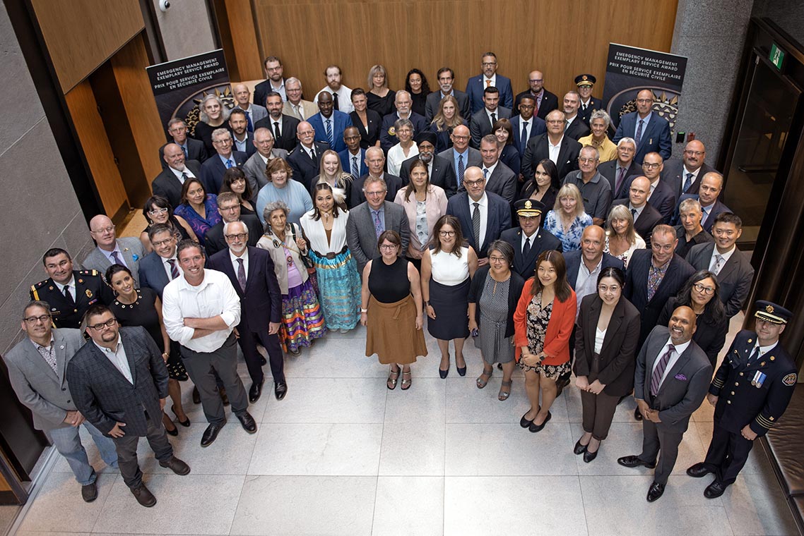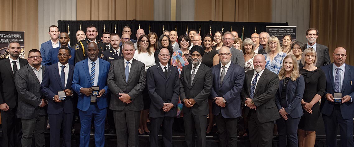 L'honorable Harjit S. Sajjan, président du Conseil privé du roi pour le Canada, ministre de la Protection civile et ministre responsable de l'Agence de développement économique du Pacifique du Canada, et l'honorable Bloyce Thompson, vice-premier ministre, procureur général, ministre de la Justice et de la Sécurité publique, Île-du-Prince-Édouard sont photographiés en compagnie des lauréats 2022 du Prix pour service exemplaire en sécurité civile.