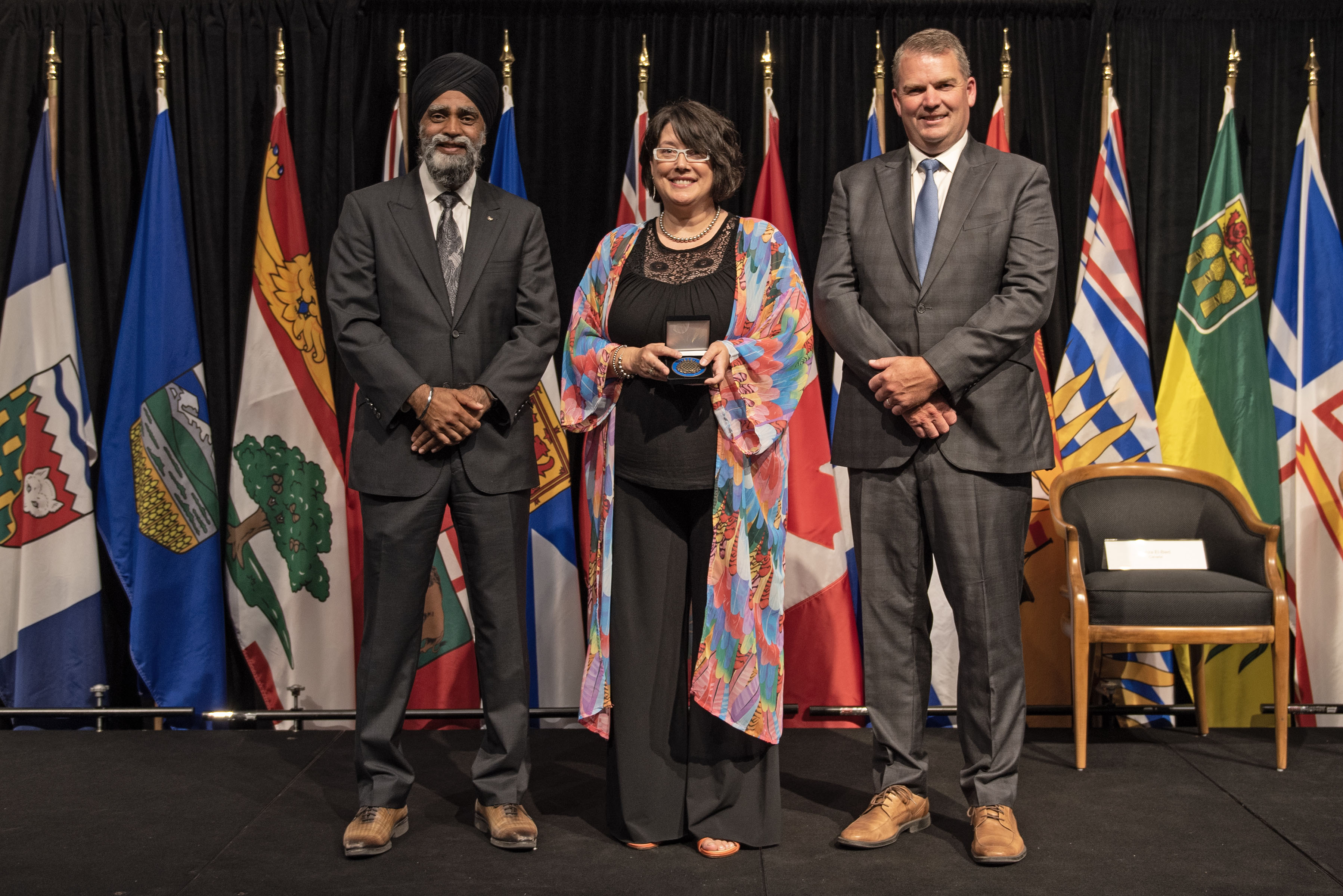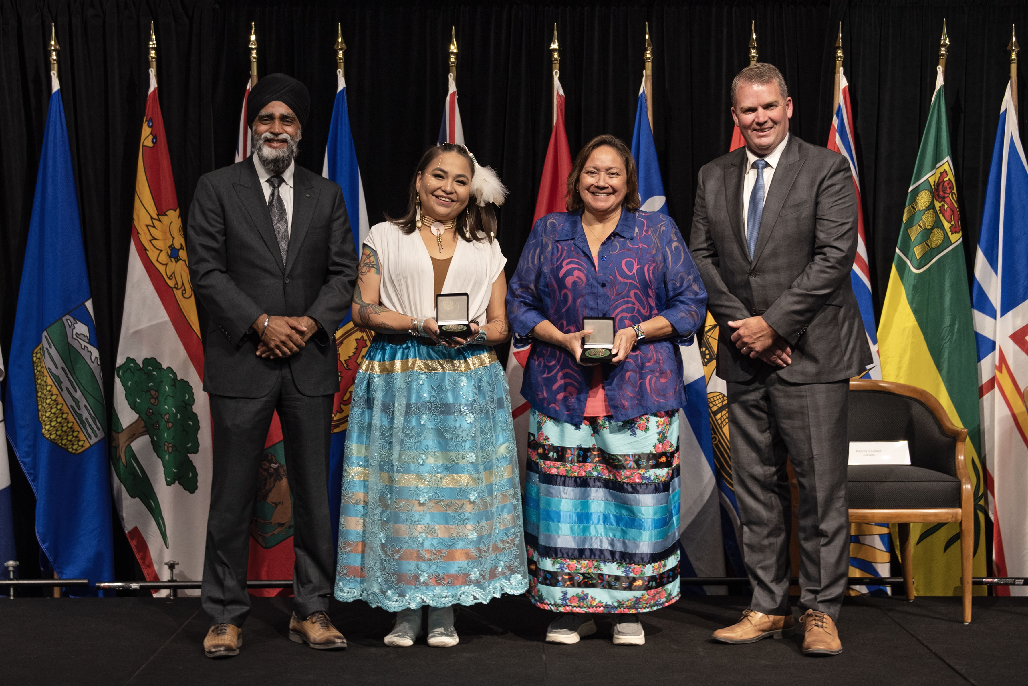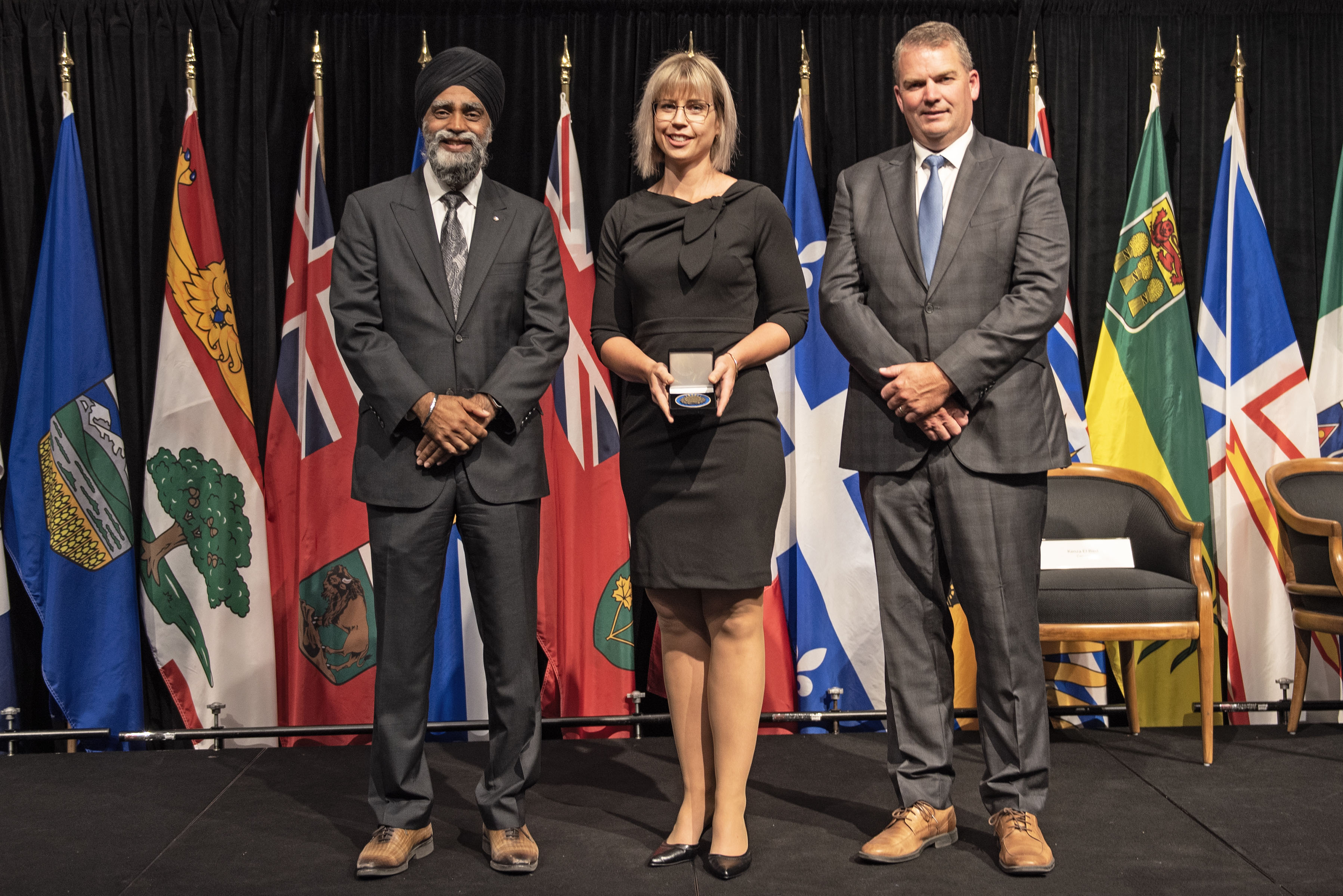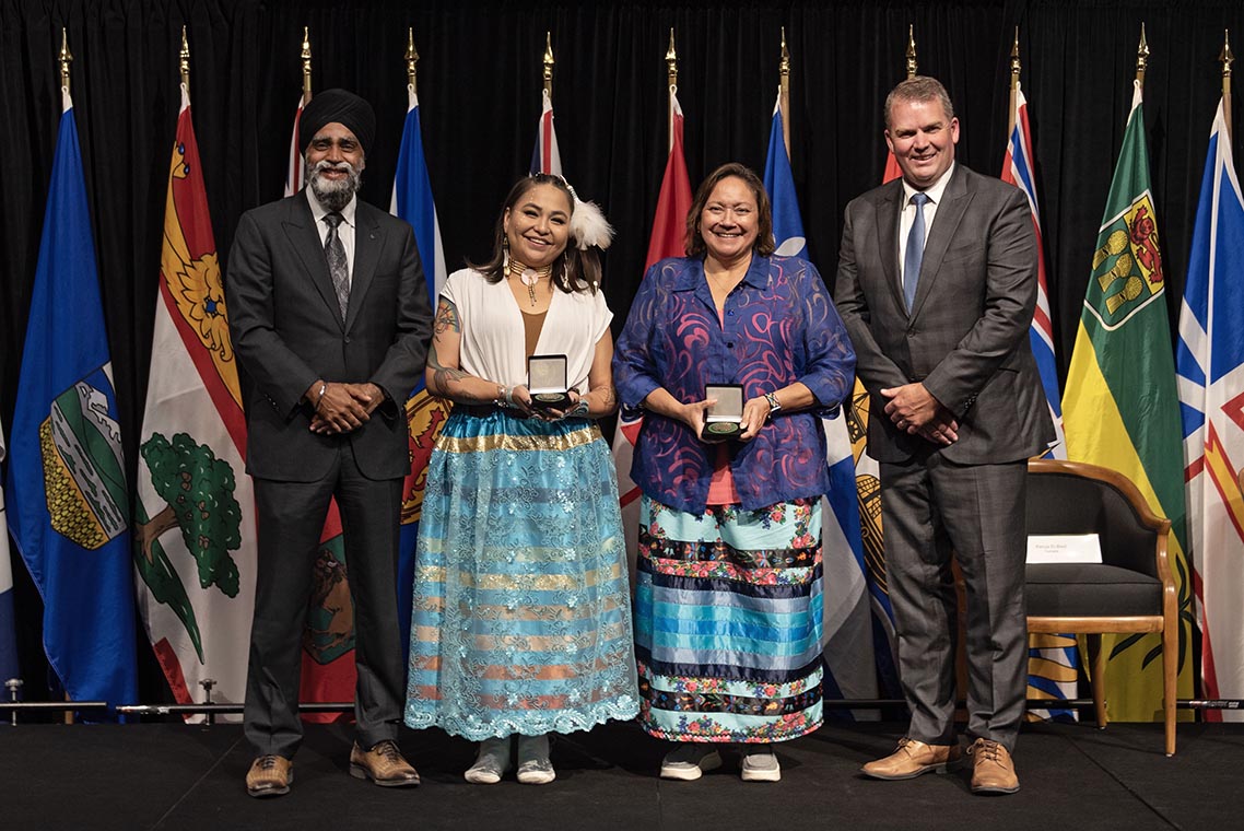 L'honorable Harjit S. Sajjan, président du Conseil privé du roi pour le Canada, ministre de la Protection civile et ministre responsable de l'Agence de développement économique du Pacifique du Canada, et l'honorable Bloyce Thompson, vice-premier ministre, procureur général, ministre de la Justice et de la Sécurité publique, Île-du-Prince-Édouard sont photographiés en compagnie des lauréats 2022 du Prix pour service exemplaire en sécurité civile.
