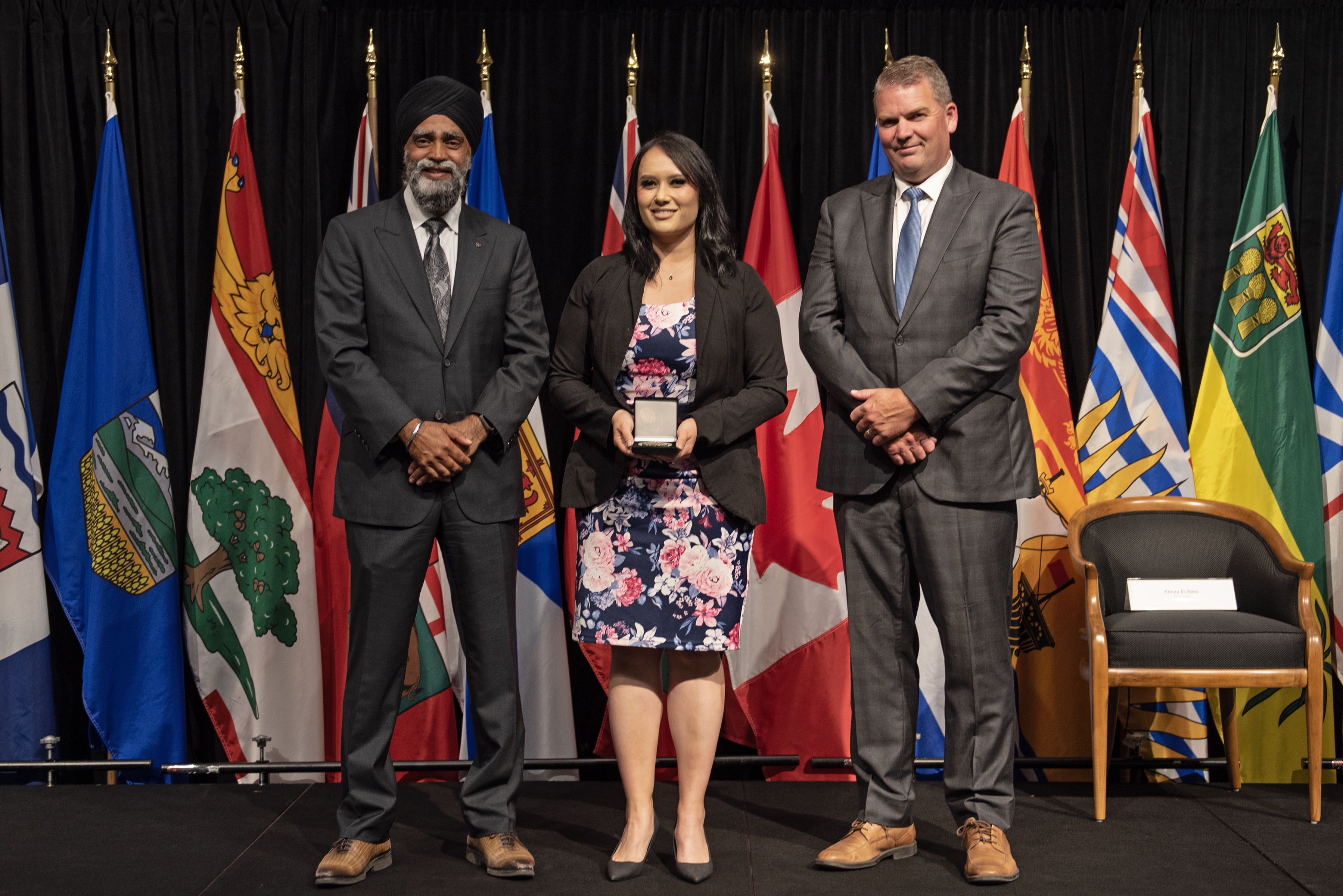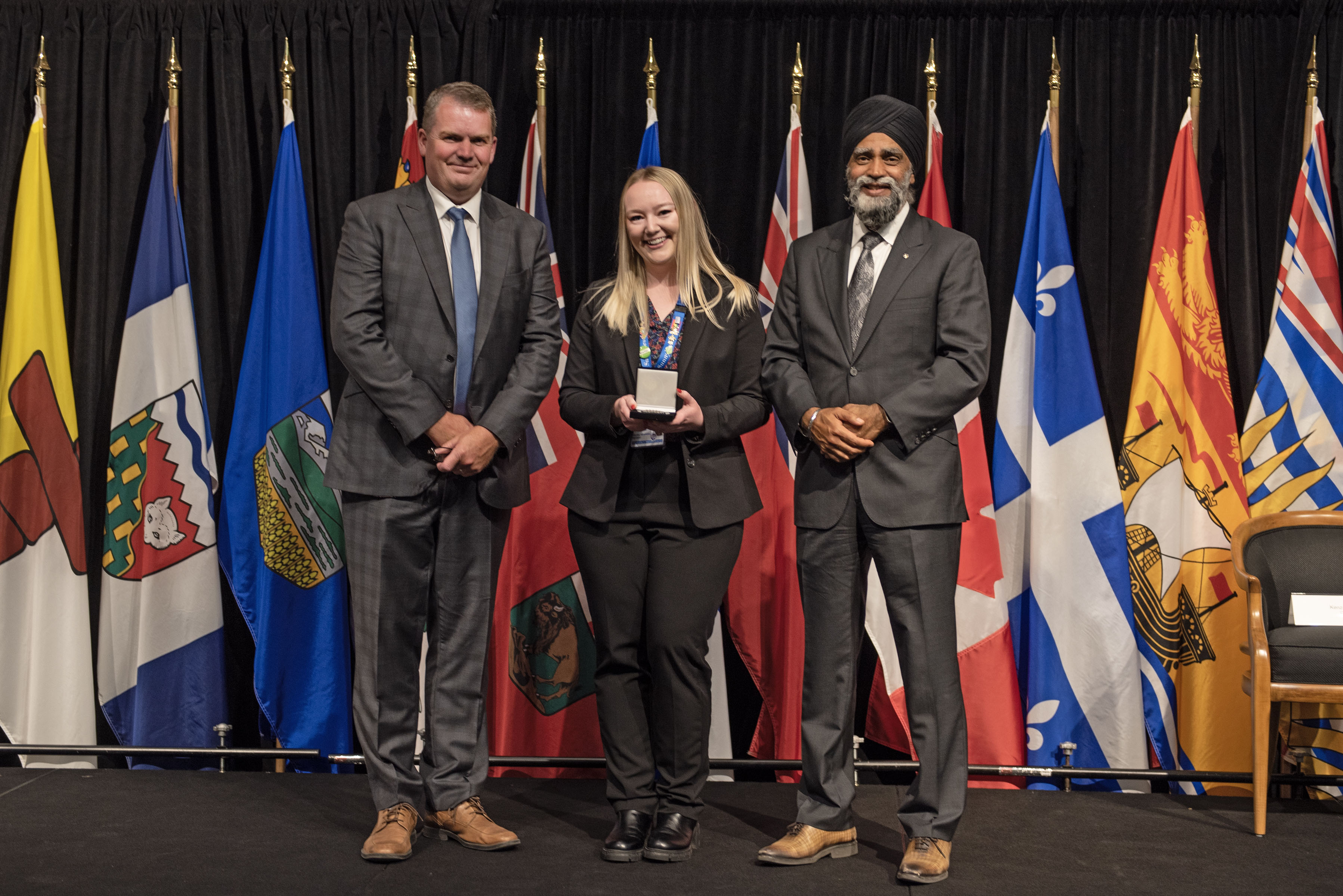 L'honorable Harjit S. Sajjan, président du Conseil privé du roi pour le Canada, ministre de la Protection civile et ministre responsable de l'Agence de développement économique du Pacifique du Canada (à l'extrême gauche), et l'honorable Bloyce Thompson, vice-premier ministre, procureur général, ministre de la Justice et de la Sécurité publique, Île-du-Prince-Édouard (à l'extrême droite) sont photographiés en compagnie du lauréat 2022 du Prix pour service exemplaire en sécurité civile pour la catégorie des jeunes.
