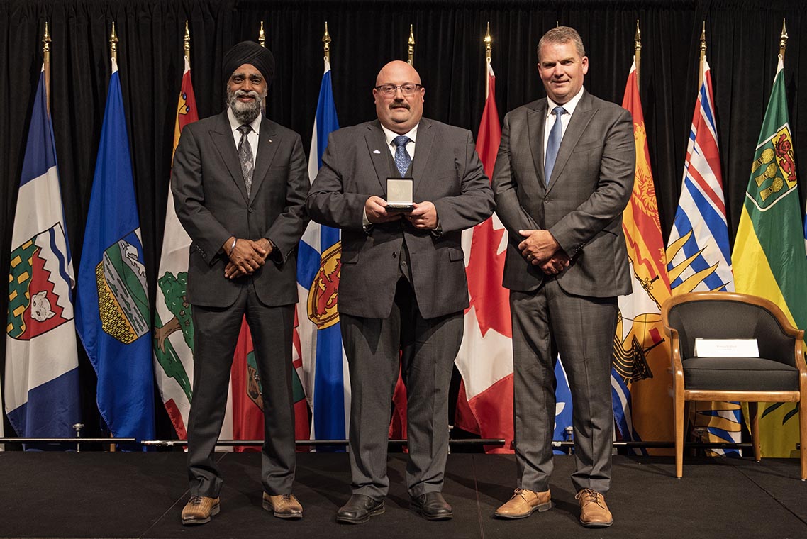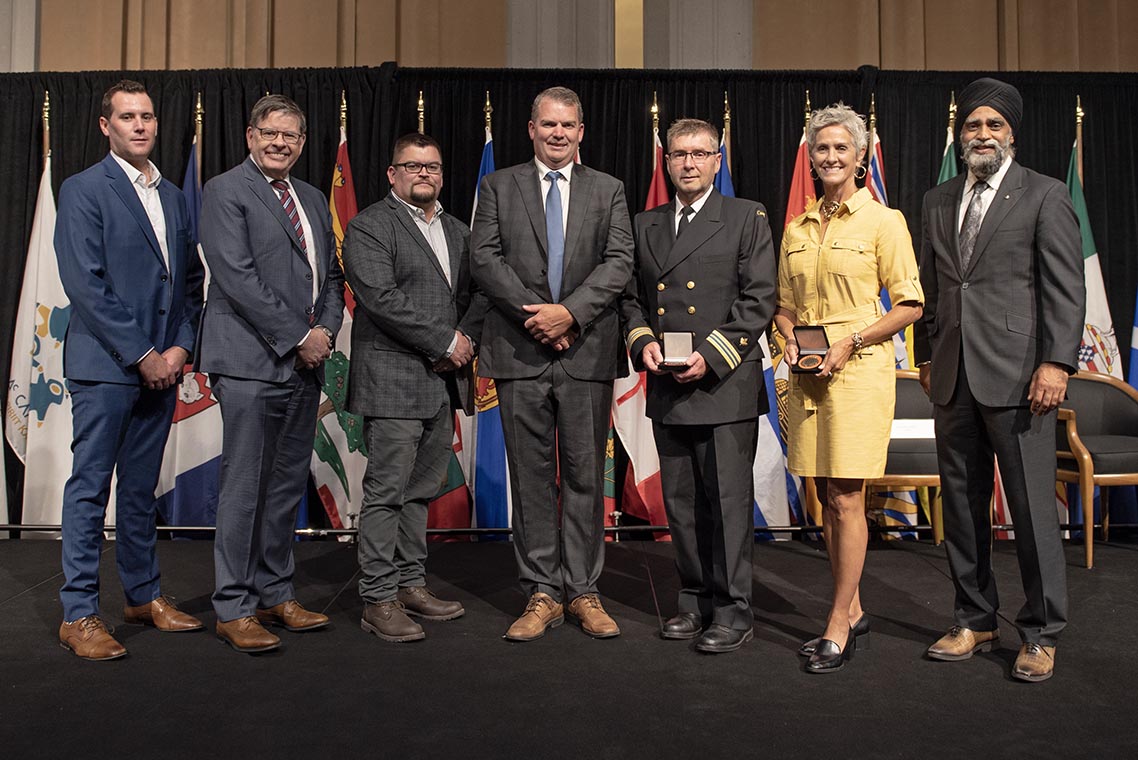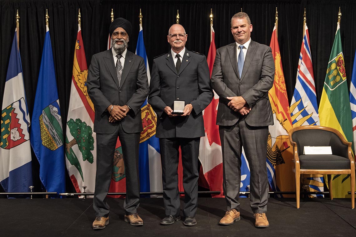 L'honorable Harjit S. Sajjan, président du Conseil privé du roi pour le Canada, ministre de la Protection civile et ministre responsable de l'Agence de développement économique du Pacifique du Canada (à l'extrême gauche), et l'honorable Bloyce Thompson, vice-premier ministre, procureur général, ministre de la Justice et de la Sécurité publique, Île-du-Prince-Édouard (à l'extrême droite) sont photographiés en compagnie du lauréat 2022 du Prix pour service exemplaire en sécurité civile pour la catégorie de recherche et sauvetage.