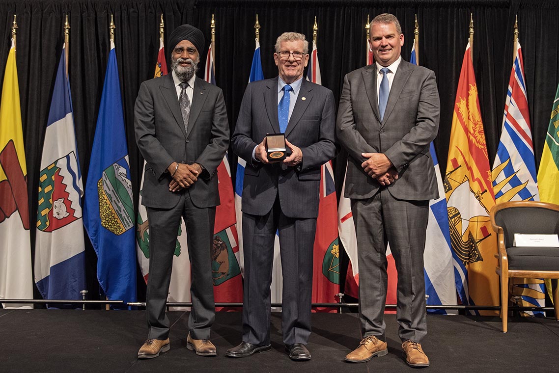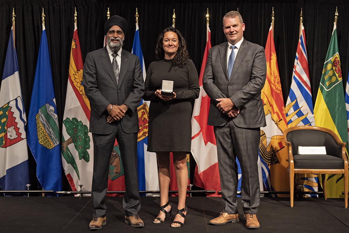 L'honorable Harjit S. Sajjan, président du Conseil privé du roi pour le Canada, ministre de la Protection civile et ministre responsable de l'Agence de développement économique du Pacifique du Canada (à l'extrême gauche), et l'honorable Bloyce Thompson, vice-premier ministre, procureur général, ministre de la Justice et de la Sécurité publique, Île-du-Prince-Édouard (à l'extrême droite) sont photographiés en compagnie du lauréat 2022 du Prix pour service exemplaire en sécurité civile pour la catégorie des communautés résilientes.