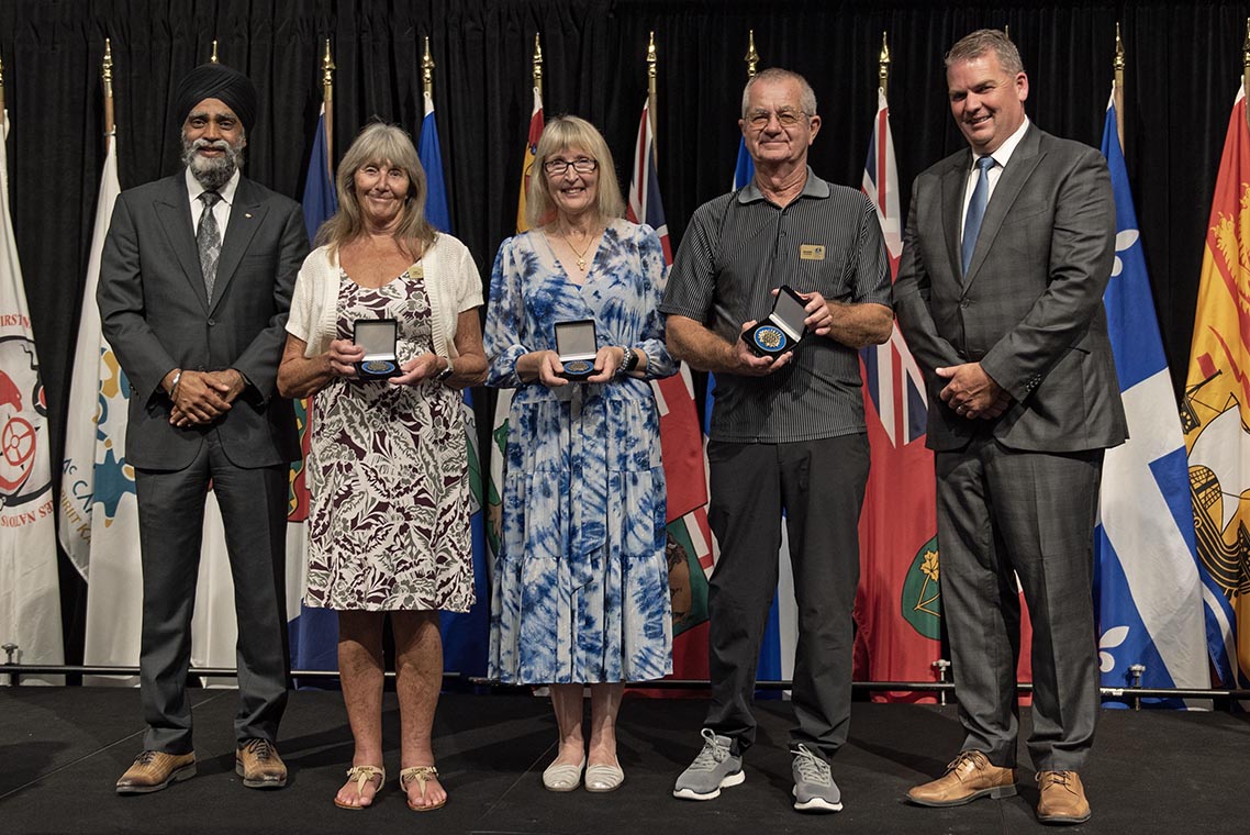 L'honorable Harjit S. Sajjan, président du Conseil privé du roi pour le Canada, ministre de la Protection civile et ministre responsable de l'Agence de développement économique du Pacifique du Canada (à l'extrême gauche), et l'honorable Bloyce Thompson, vice-premier ministre, procureur général, ministre de la Justice et de la Sécurité publique, Île-du-Prince-Édouard (à l'extrême droite) sont photographiés en compagnie du lauréat 2022 du Prix pour service exemplaire en sécurité civile pour la catégorie des bénévoles en recherche et sauvetage.