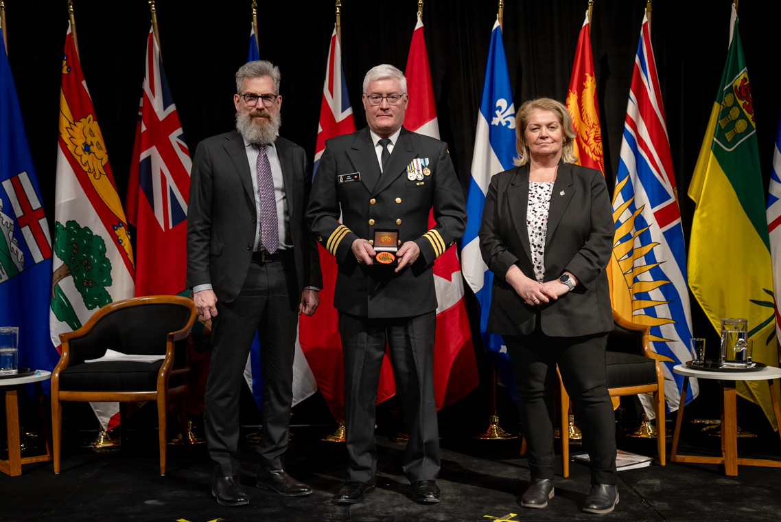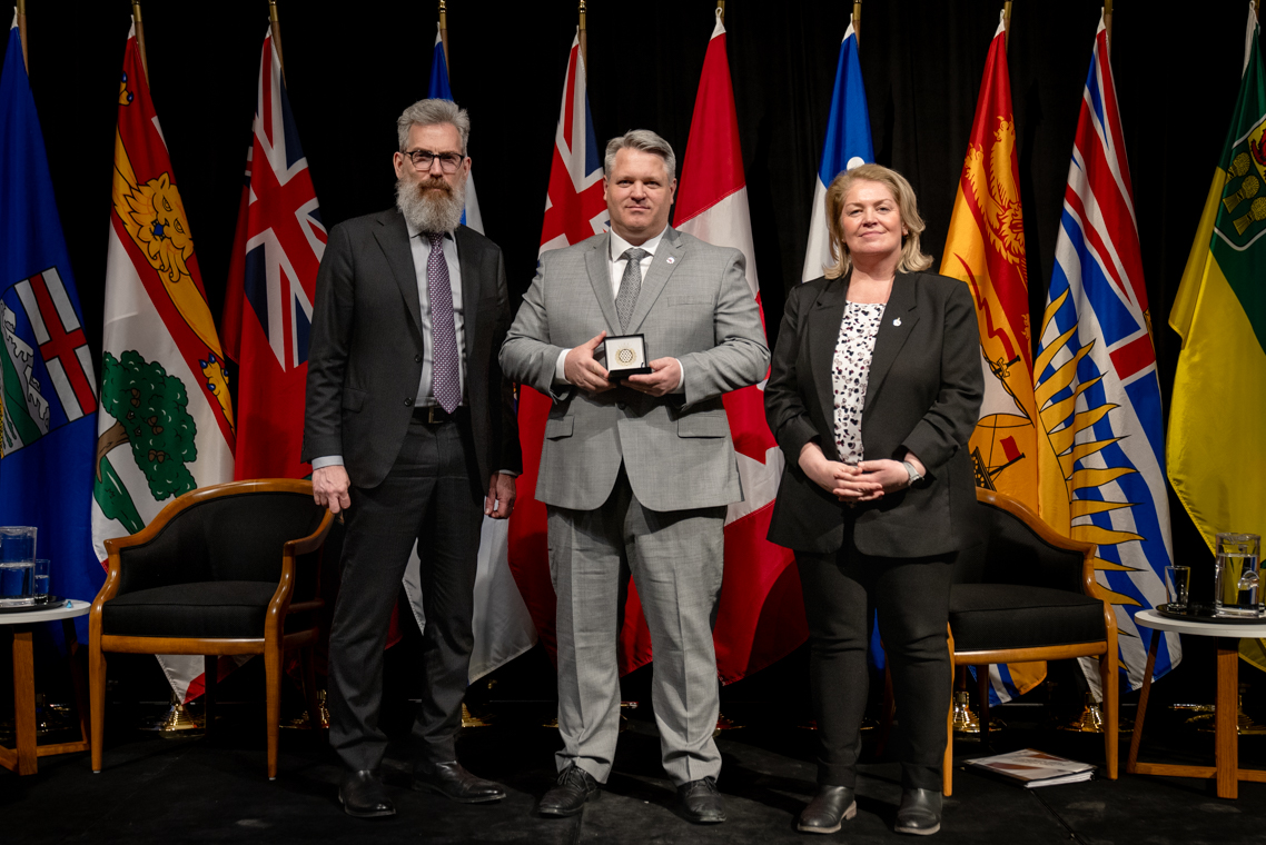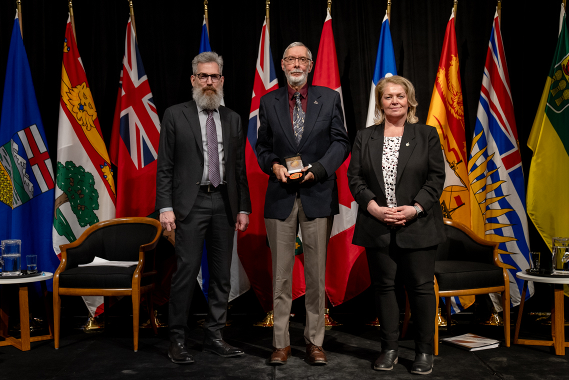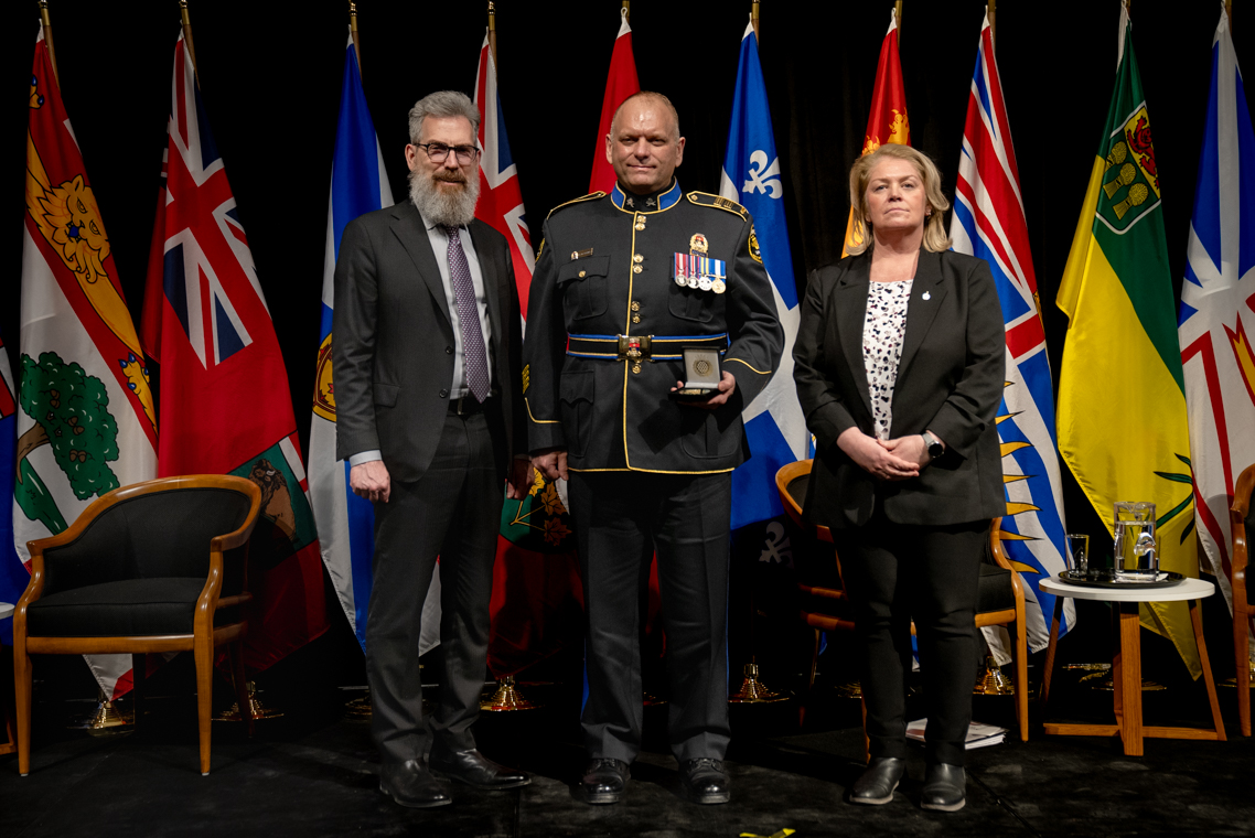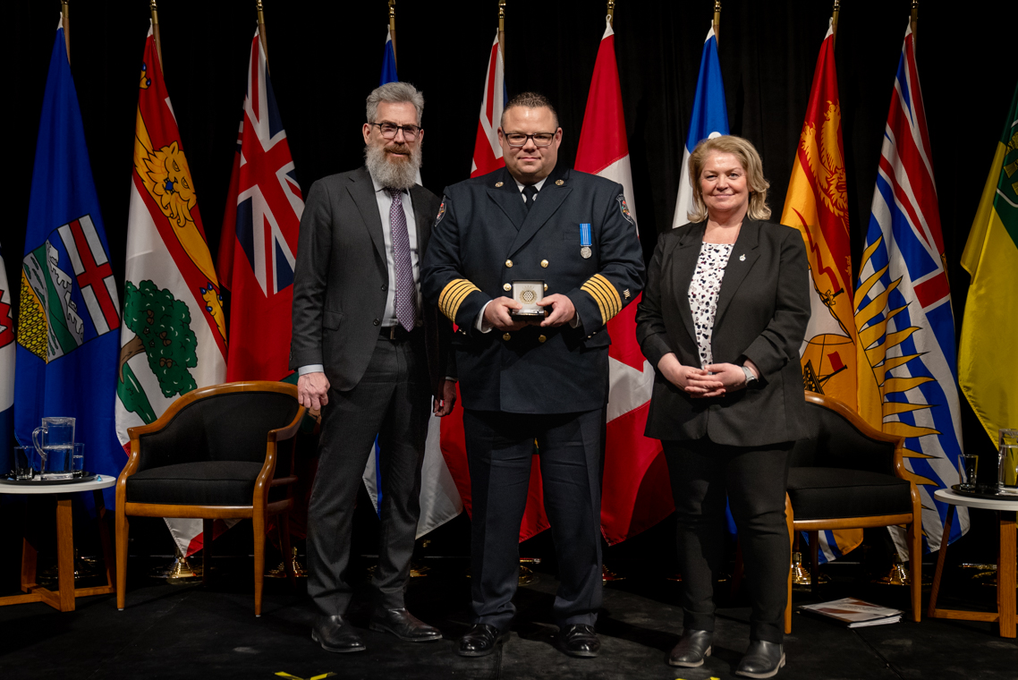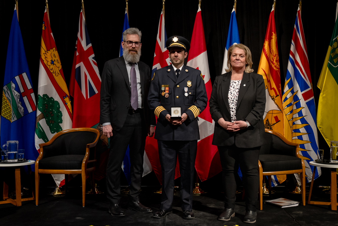 L'honorable Harjit S. Sajjan, président du Conseil privé du roi pour le Canada, ministre de la Protection civile et ministre responsable de l'Agence de développement économique du Pacifique du Canada et Sherry Romanado, secrétaire parlementaire du président du Conseil privé du Roi pour le Canada et ministre de la Protection civile sont photographiés en compagnie du lauréat 2024-2025 du Prix pour service exemplaire en sécurité civile pour la catégorie en recherche et sauvetage.