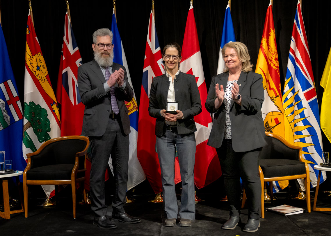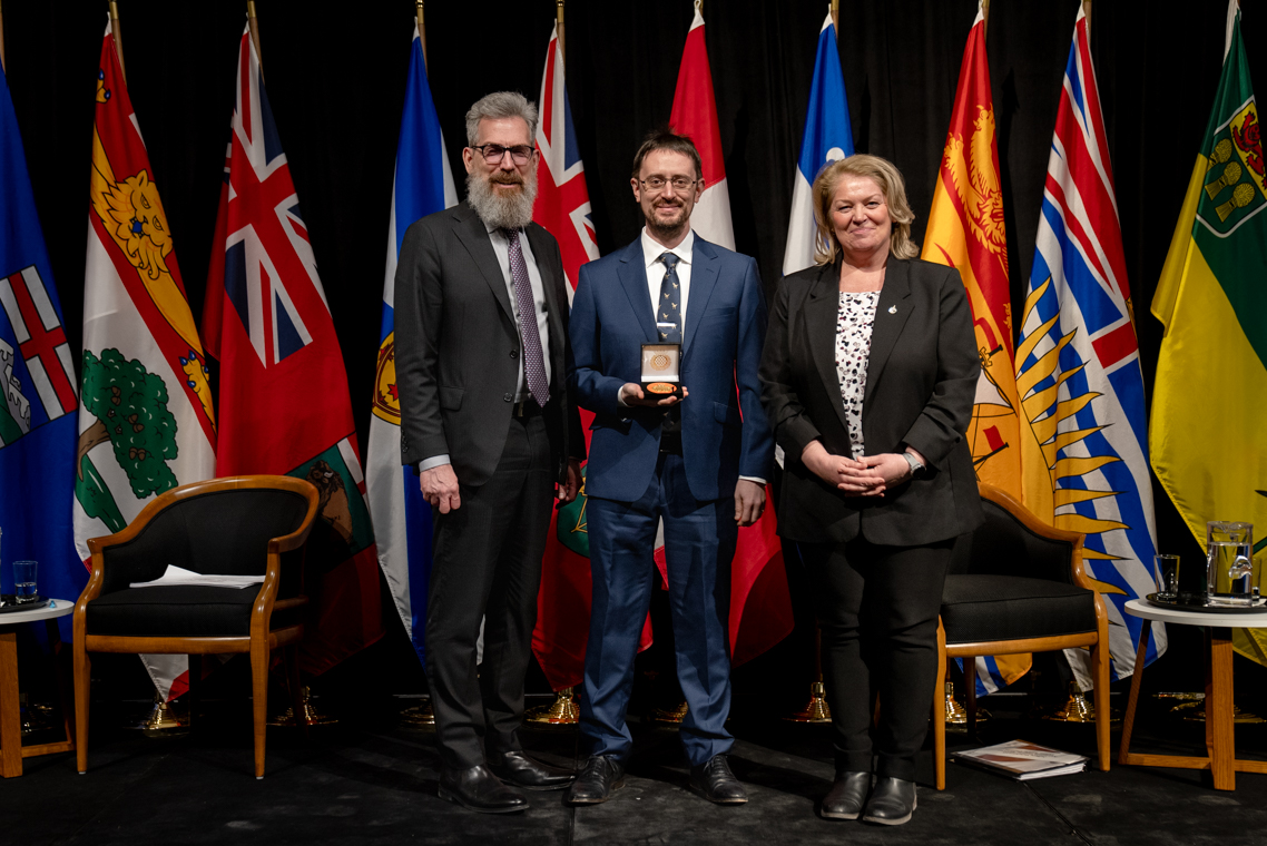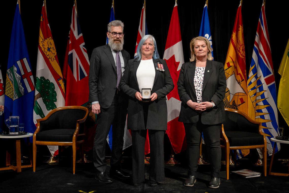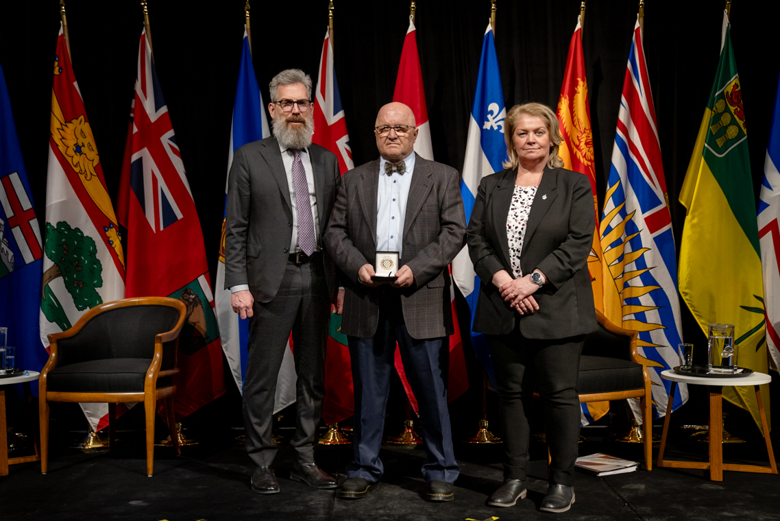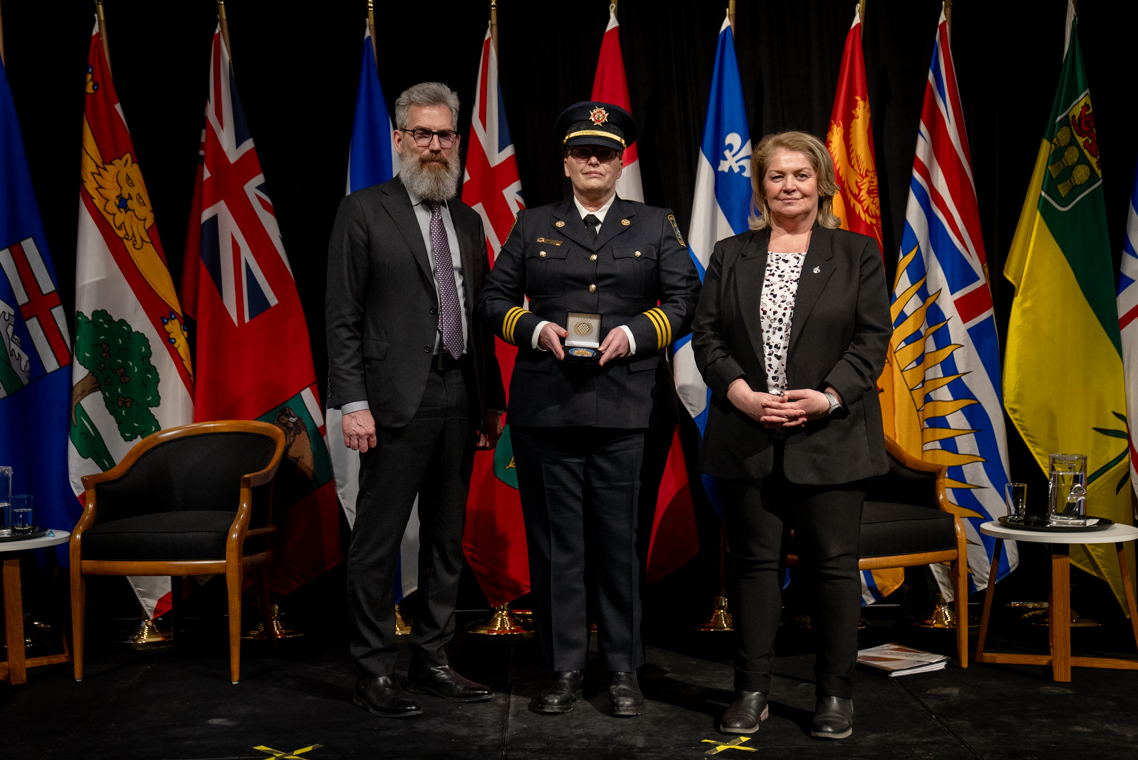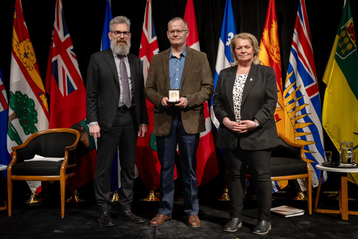 L'honorable Harjit S. Sajjan, président du Conseil privé du roi pour le Canada, ministre de la Protection civile et ministre responsable de l'Agence de développement économique du Pacifique du Canada et Sherry Romanado, secrétaire parlementaire du président du Conseil privé du Roi pour le Canada et ministre de la Protection civile sont photographiés en compagnie du lauréat 2024-2025 du Prix pour service exemplaire en sécurité civile pour la catégorie en recherche et sauvetage.