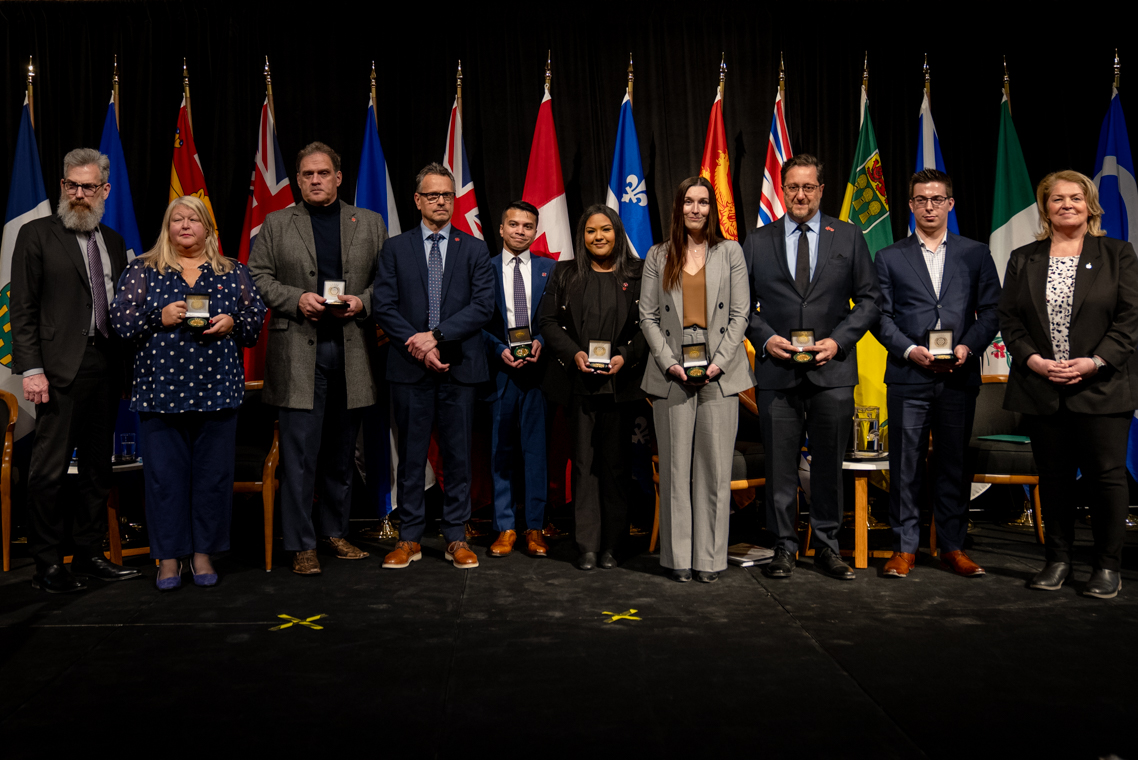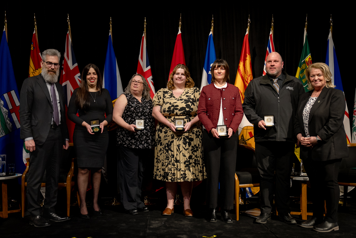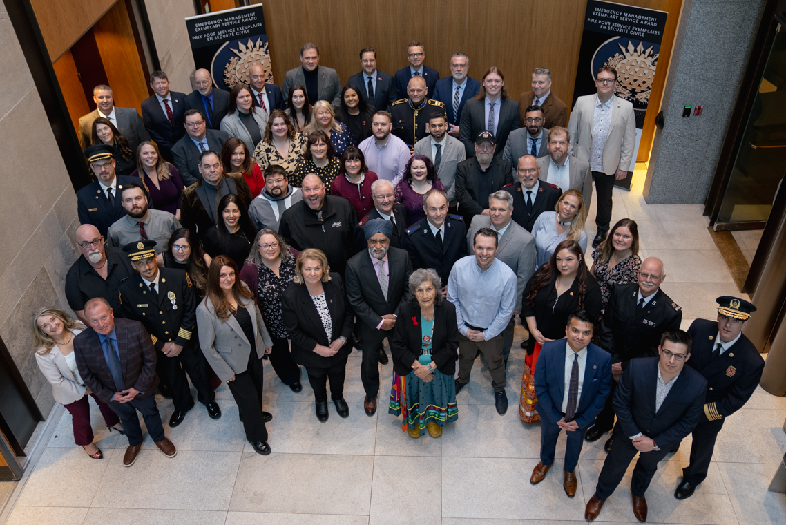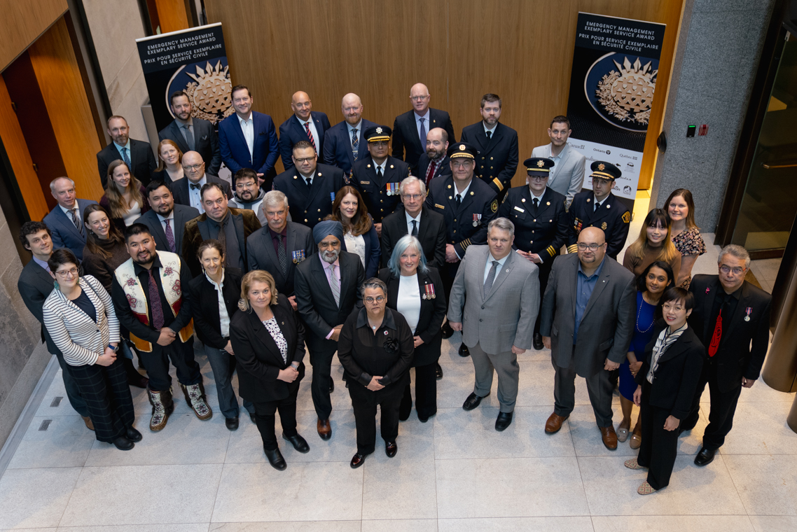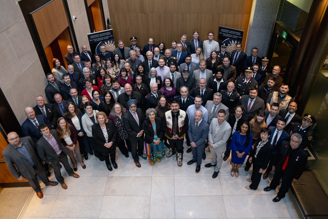 L'honorable Harjit S. Sajjan, président du Conseil privé du roi pour le Canada, ministre de la Protection civile et ministre responsable de l'Agence de développement économique du Pacifique du Canada et Sherry Romanado, secrétaire parlementaire du président du Conseil privé du Roi pour le Canada et ministre de la Protection civile sont photographiés en compagnie des lauréats 2024-2025 du Prix pour service exemplaire en sécurité civile.