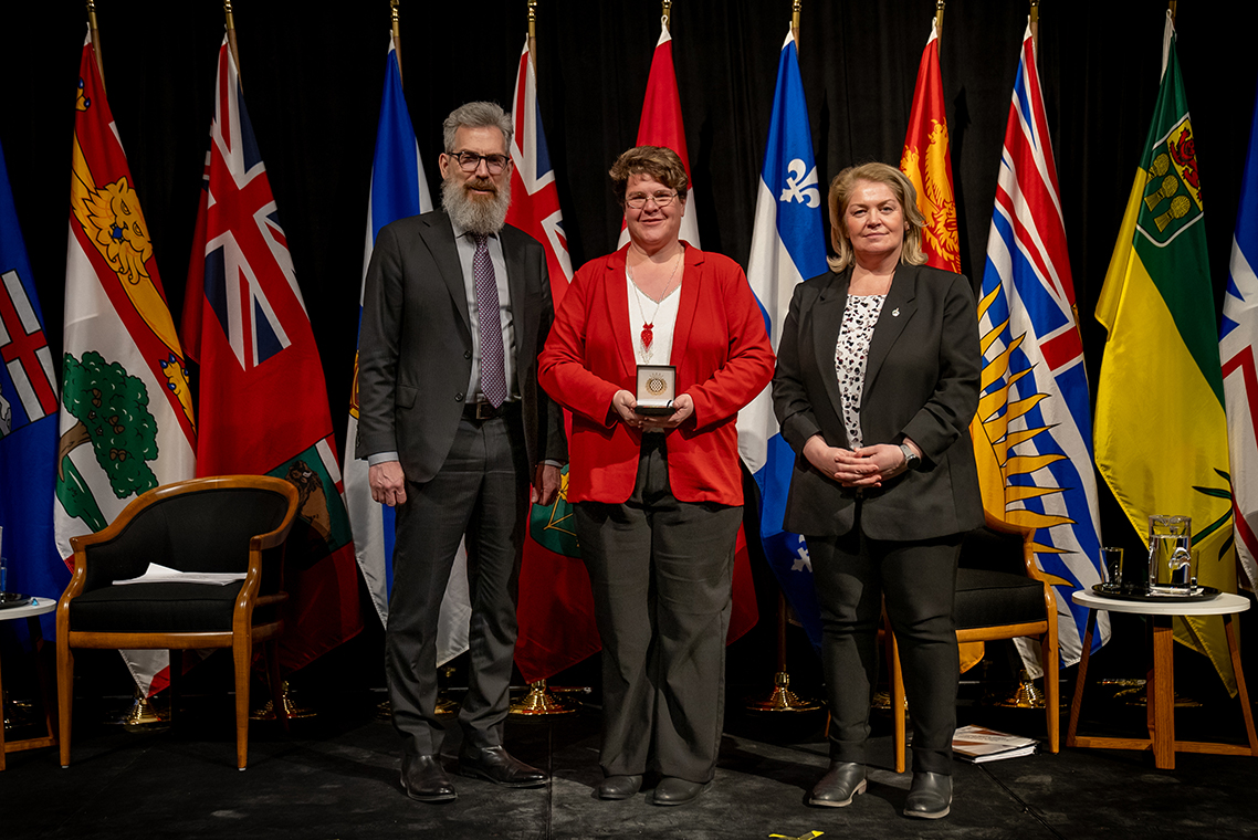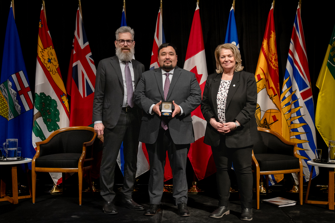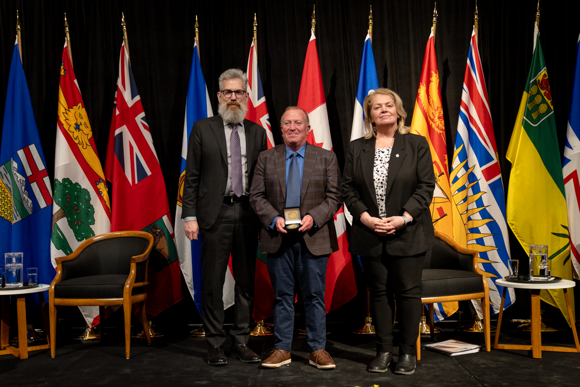 L'honorable Harjit S. Sajjan, président du Conseil privé du roi pour le Canada, ministre de la Protection civile et ministre responsable de l'Agence de développement économique du Pacifique du Canada et Sherry Romanado, secrétaire parlementaire du président du Conseil privé du Roi pour le Canada et ministre de la Protection civile sont photographiés en compagnie du lauréat 2024-2025 du Prix pour service exemplaire en sécurité civile pour la catégorie des communautés résilientes.
