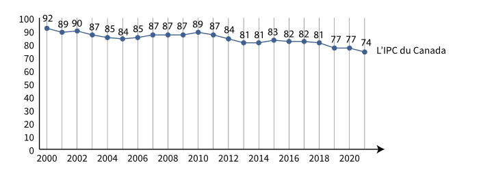 Graphique linéaire montrant la note du Canada sur l'Indice de perception de la corruption de 2000 à 2021. On peut constater une tendance à la baisse soutenue de la note du Canada, la note atteignant un sommet de 92 en 2000 et diminuant graduellement pour s'établir à 74 en 2021. On a constaté une légère augmentation en 2010, quand la note du Canada a atteint 89, avant de poursuivre sa tendance à la baisse. Les données complètes sont disponibles ci-dessous.